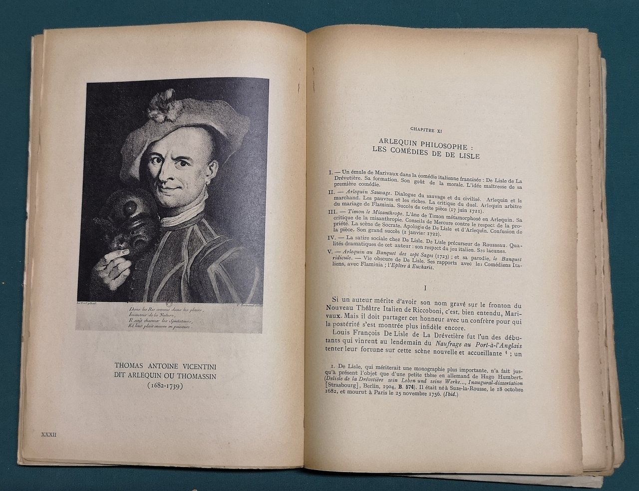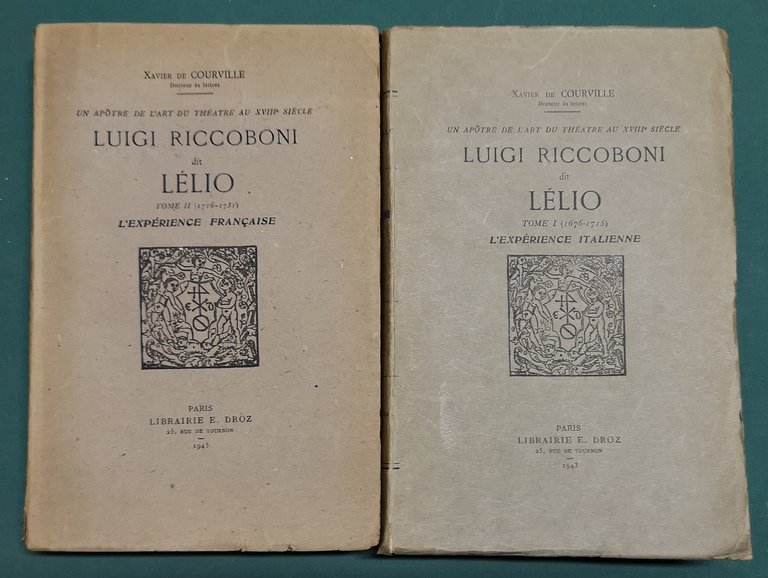 >2 vol. in-8 gr., pp. VII, 356, 351, numerose tavole a p.pag. f.t., broch. edit. Si acclude il fascicolo di 63 pp. ''Introduction et bibliographie''. Interessante studio dedicato a Luigi Riccoboni, attore ed autore drammatico, direttore della Comédie italienne. L'opera percorre la carriera artistica del Riccoboni: la sua prima apparizione sulla scena a 14 anni, la tragi-commedia alla spagnola (Griselde), i due mostri di Riccoboni (Sansone ed Ercole), Elena Balletti (commediografa e musa), La compagnia di Lélio e Falminia, la tragédie française, la tragedia di Martelli, il trionfo di Merope, la commedia letteraria, da Riccoboni a Alfieri, da Riccoboni a Goldoni.