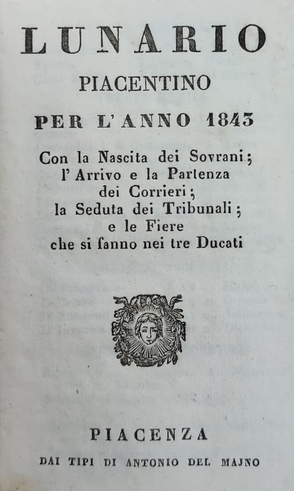 LUNARIO PIACENTINO PER L' ANNO 1843 CON LA NASCITA DEI SOVRANI; L' ARRIVO E LA PARTENZA DEI CORRIERI; LA SEDUTA DEI TRIBUNALI; E LE FIERE CHE SI FANNO NEI TRE DUCATI