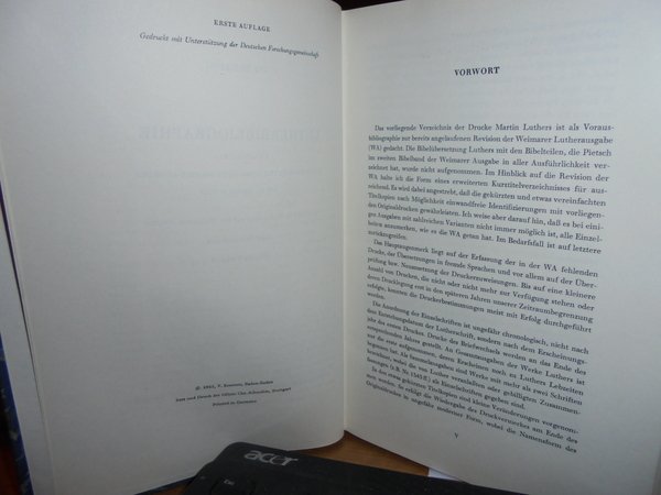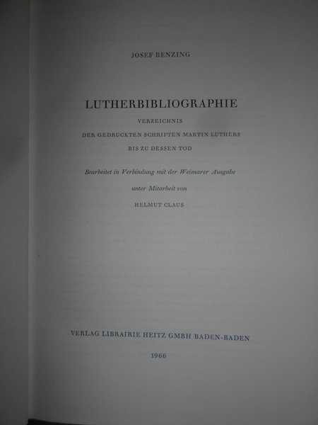 JOSEF, BENZING. Baden-Baden, Verlag Librairie Heitz Gmbh, 1966. LUTHERBIBLIOGRAPHIE Verzeichnis der Gedruckten Schriften Martin Luthers bis zu Dessen Tod. Unter Mitarbeit von Helmut Claus. In-8°, m. pelle con fregi e titolo in oro al dorso. xi, (1), 512 pp. Come nuovo. Uff. E - IV - 2