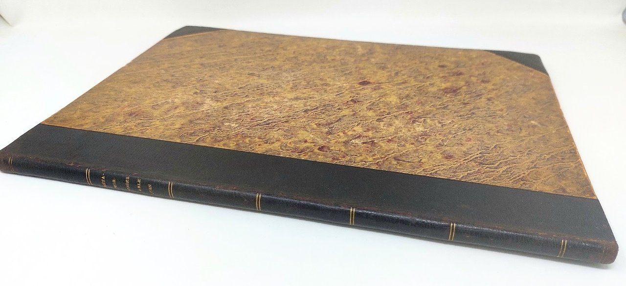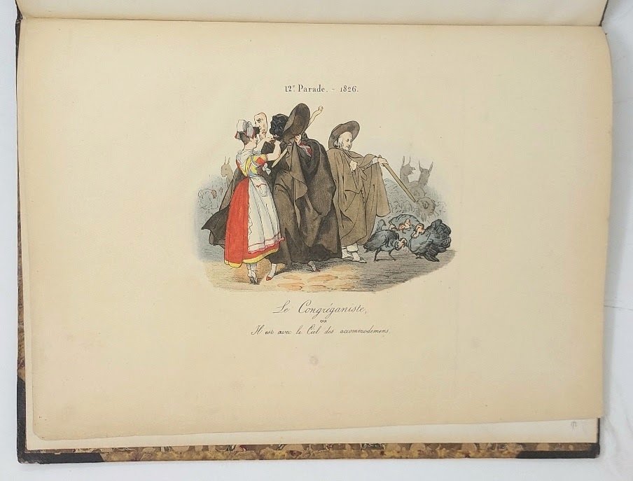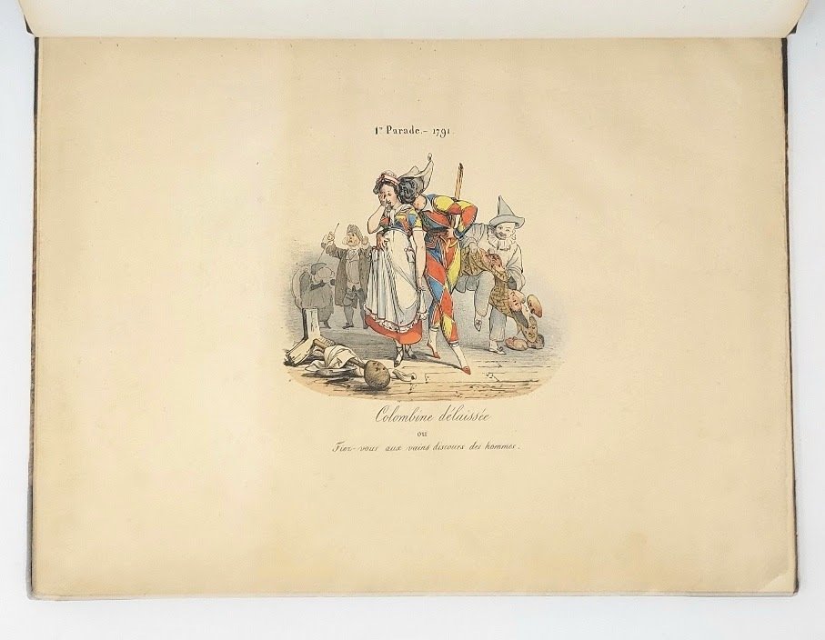 >in-4 (370x275 mm), 12 tavole litografate e colorate da mano coeva, di Langlum su disegni di Leprince, che è suggerito come autore in una vecchia scheda di catalogo incollata sul frontespizio. Il titolo è invece indicato dal titolo in oro sul dorso della bella legatura ottocentesca in m. marocchino marrone. Auguste-Xavier Leprince (1799-1826), "era figlio e allievo del pittore e litografo Anne-Pierre e fratello maggiore dei pittori Robert-Leopold (1800-47) e Gustave (1810-37)... Le sue numerose scene di strada parigine raffiguravano solitamente alcuni noti eventi contemporanei” (Grove) e sono simili ad alcune delle tavole satiriche di questa rara suite di 12 caricature di Arlecchino come personaggio subito dopo la Rivoluzione francese. L'autore e lo stampatore, che hanno preferito rimanere anonimi, non si fidavano delle leggi di censura francesi. I titoli sono seguiti da una riga di spiegazione: 1791. Columbine délaisée. - 1795. L'Orateur Populaire. - 1795. Le Directorien. - 1799. Le 18 Brumaire. - 1800. Le Grenadier des Consuls. - 1808. Le Chambellan. - 1814. Le Marquis de Bergame. - 1815. Le Champ de Mai. - 1820. Tartufe. - 1823. Le Diner. - 1825. La Clôture. - 1826. Le Congréganiste. Arlecchino non è l'unico personaggio della Commedia dell'Arte presente nella suite, sono riconoscibili anche Colombina, Pulcinella e Balanzone. Raro album figurato e colorato a mano, una curiosa ed affascinante allegoria politica con il teatro come sfondo e Arlecchino come personaggio degli eventi politici in Francia negli anni 1791-1826. Il fatto che l'album sia stato pubblicato, senza attribuzione dell'editore o dell'artista, in Belgio piuttosto che in Francia, suggerisce fortemente il timore di incorrere nelle leggi di censura della stampa francese dell'epoca. Buon esemplare, carta leggermente brunita.