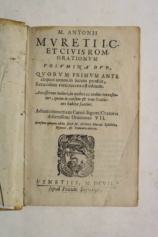 M. Antonii Mureti I. C. et. civis. Rom. Orationum. Volumina duo. Quorum primum ante aliquot annos in lucem prodijt Secundum verò recens est editum… Accesserunt indices, . Adiunximus etiam CaroliSigonij Orationes VII.