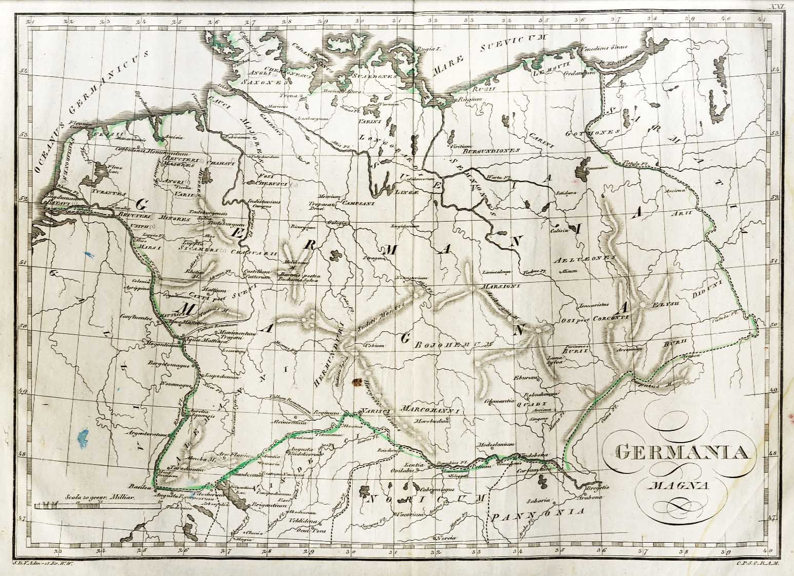 >incisione in rame, cm 42x32 e margini, tratta da: Tabulae geographicae orbis veteribus noti, Vienna, in libraria C. Rad et. annae in platea Joannis, [n.d.].