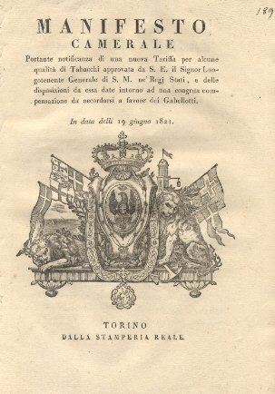 Manifesto camerale portante notificanza di una nuova Tariffa per alcune qualità di Tabacchi approvata da S. E. il Signor Luogotenente Generale di S. M. ne' Regij Stati, e delle disposizioni da essa date intorno ad una congrua compensazone da accordarsi.19 giugno 1821.