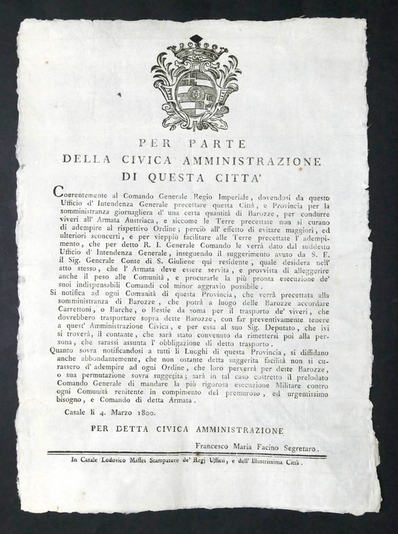 Manifesto Città di Casale Adempimento rifornimento viveri Armata Austriaca 1800