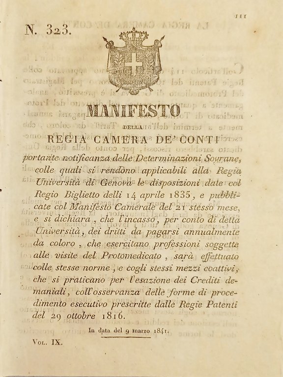 Manifesto della Regia Camera De' Conti - Portante notificanza delle Determinazioni Sovrane, colle quali si rendono applicabili alla Regia Università di Genova le disposizioni - 1841 Testo in lingua italiana. Pagine 3 N. 323 Condizioni molto buone come da foto.