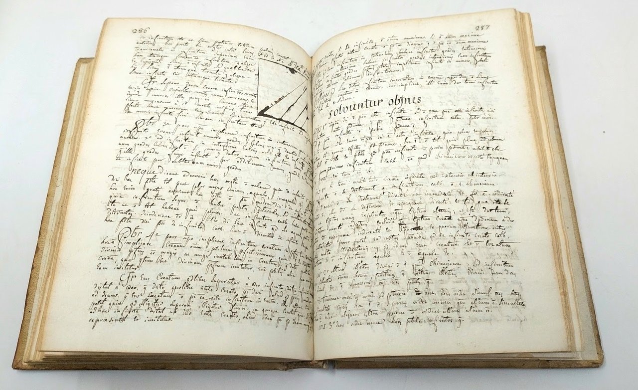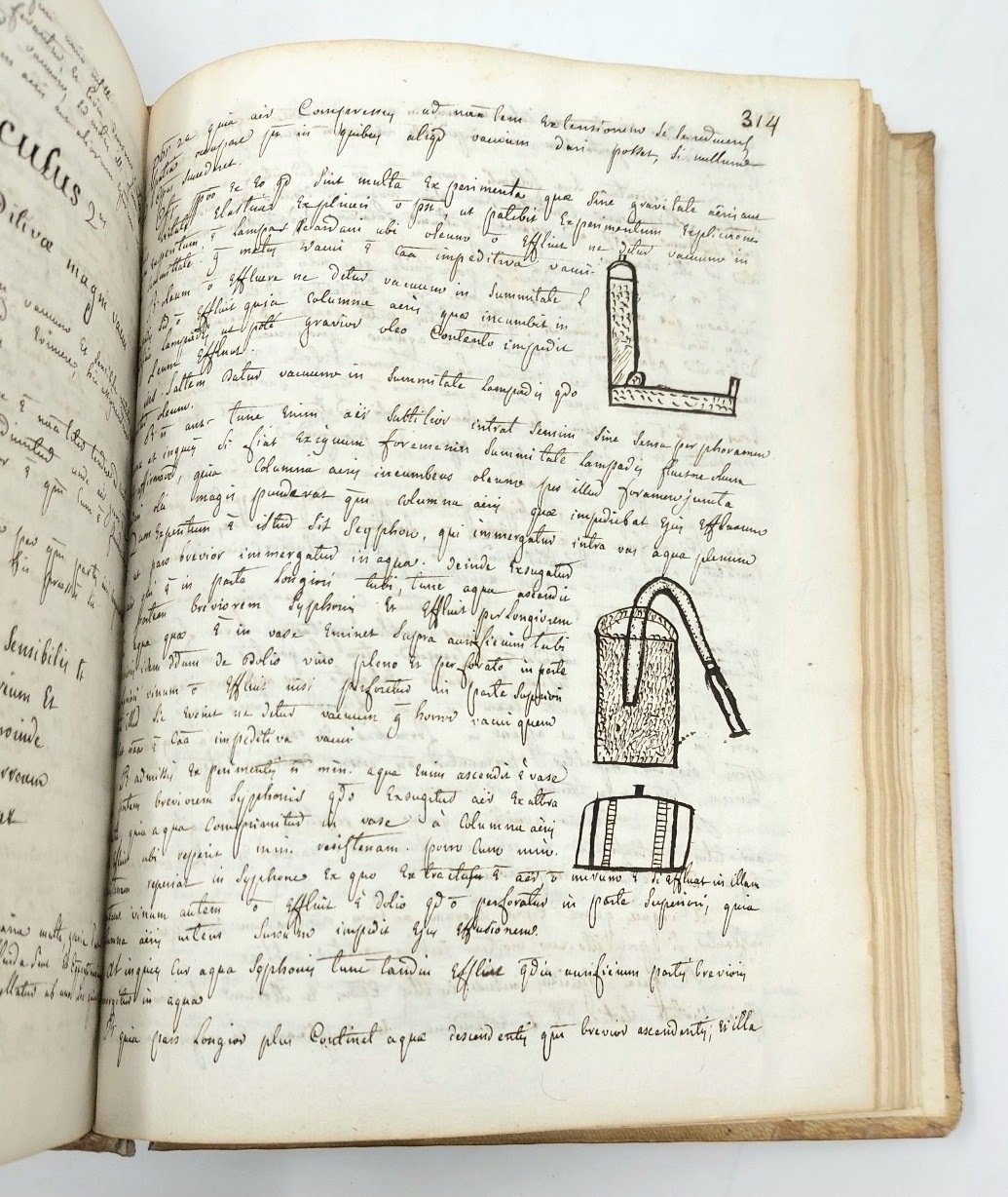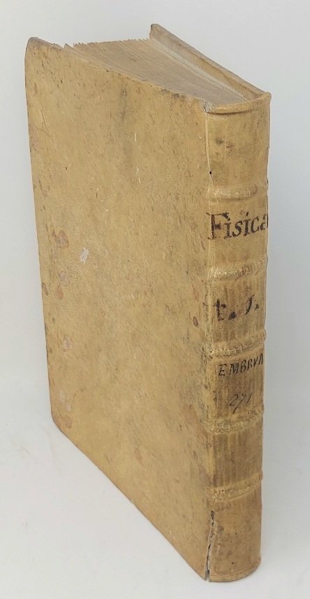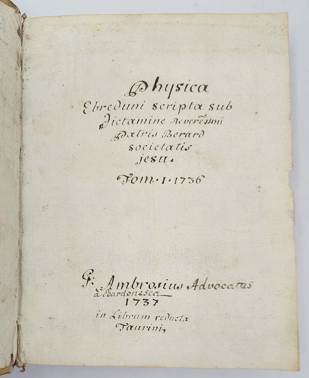 >in-4 (mm 210x155), composto da un frontespizio, pp. 357 numerate in chiara grafia, (9) di indici e 2 ff. bianchi, con alcune figure disegnate ad inchiostro n.t.; legatura coeva in pergamena, titolo manoscritto al dorso. Trattato di fisica, in latino, particolarmente curioso poiché scritto ad Embrun, dal padre gesuita Berard, e trascritto e sistematizzato da un avvocato di Bardonecchia. Interessante testimonianza della circolazione tra Francia e Italia di testi manoscritti nella prima metà del XVIII secolo, oltre che curiosità scientifica. Buon esemplare.
