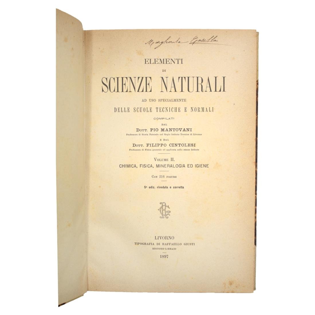 Autore: Mantovani & Cintolesi Titolo: Elementi di Scienze Naturali Sottotitolo: Ad uso specialmente delle scuole tecniche e normali - Volume II: Chimica, Fisica, Mineralogia ed igiene. Edizione: Livorno 1897 Dimensioni: 16 x 23 cm c.a. Pagine: 300 Copertina: Rigida Condizioni: Buone come da foto