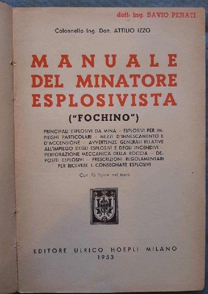 In 8', br. ed. ill. col. pp. 189, principali esplosivi da mina-esplosivi per impieghi particolari-mezzi d'innescamento e d'accensione-avvertenze generali relative all'impiego degli esplosivi e degli incendivi-perforazione meccanica della roccia-depositi esplosivi-prescrizioni regolamentari per ricevere e consegnare esplosivi, con 75 figure nel testo; dorso in buona parte mancante, piatto ant staccato, timbro del propr. ai margini dell' occhiello e del frontespizio, segni d'uso e del tempo, raro.Luogo di pubblicazione MIlanoEditore HoepliAnno pubblicazione 1953Materia/Argomento Manuali, Esplosivi ***Due to bureaucratic reasons, books dated over 70 years old cannot be immediately exported, please contact us before placing the order.***