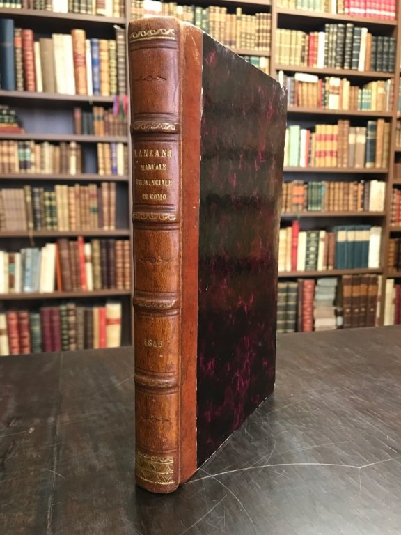 In-8° (cm. 22,8), legatura coeva in mezza pelle con titolo e sobrie decorazioni in oro e a secco al dorso; pp. XX 308 in ottimo stato, con una tavola illustrativa in antiporta (Cattedrale di Como), frontespizio inquadrato in cornice e decorato con svolazzi alla foggia romantica, dedica al vescovo Carlo Romanò; alcune sporadiche fioriture e una leggera brunitura uniforme, Ex libris impresso al risguardo della libreria Nani e scritte a matita ottocentesche al solo primo foglio bianco. Edizione originale della compilazione che racchiude un'infinità di cognizioni sul territorio. Esemplare molto buono. (NH5)