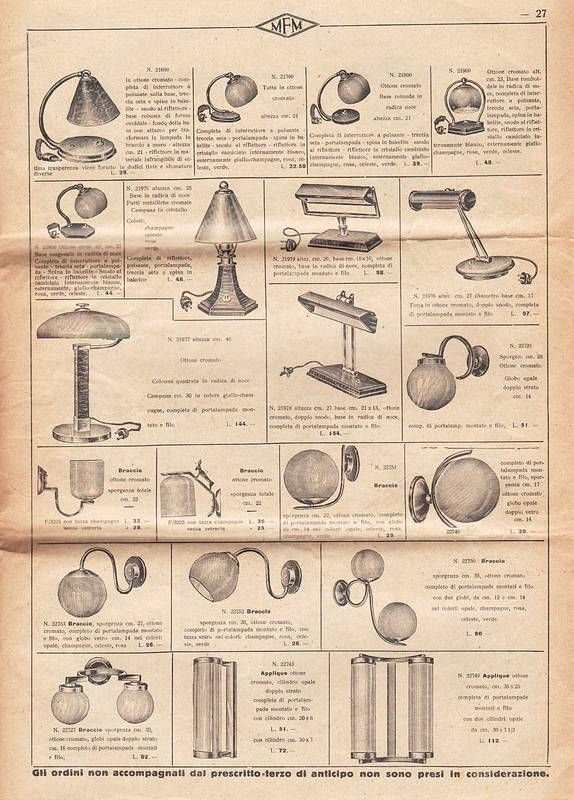 Forma rivista cm. 34x25,legatura in brosura editoriale, pp. 34, con centinalia di illustrazioni in zincotipia,raffig. materiale elettrico, interruttori, comutatori, suonerie, campanelli, lampade votive, riflettori e lampadari con varietà di globi in vetro. Dorso consunto e seni di piegatura per spedizione postale.