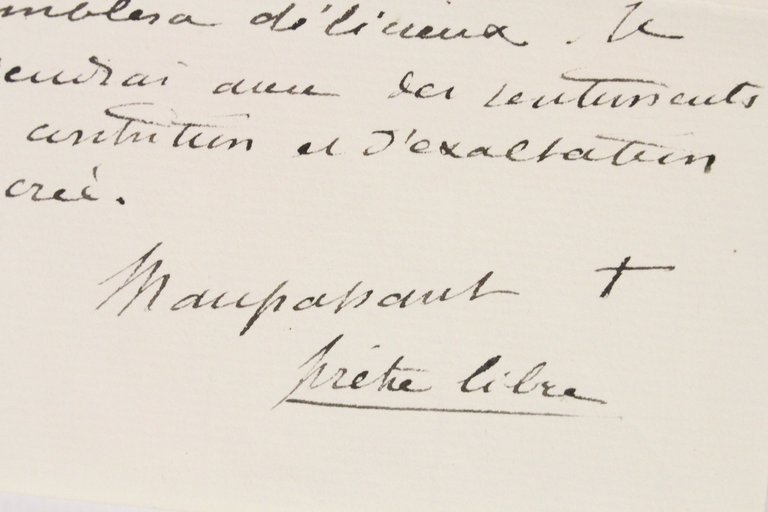 Paris s. d. [16 janvier 1884] | 10.10 x 13 cm | 2 pages sur un feuillet rempliée | [ENGLISH DESCRIPTION ON DEMAND] | Lettre autographe signée de Guy de Maupassant à la comtesse Potocka, 26 lignes à l'encre noire sur un feuillet de papier vergé à en-tête GM 83, rue Dulong. Publiée dans Marlo Johnston, « Lettres inédites de Maupassant à la comtesse Potocka », Histoires littéraires, n°40, octobre-novembre-décembre 2009. Maupassant évoque l'épisode qui marque son entrée dans la familiarité avec la comtesse : la fameuse histoire des poupées. À la suite d'un pari perdu, la comtesse Potocka avait fait envoyer à Maupassant des poupées de chiffon représentant les dames invitées à un futur dîner. Par jeu, Maupassant pris six d'entre elles et leur bourra le ventre de tissu avant de les renvoyer à la comtesse. Dans un mot qui accompagnait l'envoi, Maupassant se vantait de les avoir toutes engrossées en une seule nuit. Pour se sortir d'une soirée qu'il préfèrerait passer chez la comtesse il a du : « [.] faire des démarches de diplomate, d'employer des ruses et des machinations des plus habiles. » Malgré tout, il ne pourra que se : « [.] sauver vers onze heures ou onze heures et demie. » Afin de connaître les invitées qui se trouveront à cette soirée, il demande à Potocka : « Il faudra me redonner six poupées ». Une petite boutade qui reflète leur niveau d'intimité. Il regrette de s'être engagé pour cette soirée qui l'empêche de se rendre chez la comtesse : « Voyez-vous où j'en suis ? La soirée pour laquelle je m'étais engagé ne devant commencer à être agréable que vers minuit, tous invités partis. » À bout, il se propose de : « [.] crier, comme le beau-frère de votre amie : A moi le camphre et le nénuphar ! », les deux substances étaient utilisées comme anaphrodisiaque ou pour calmer l'énervement. Malgré son peu d'envie, il devra se rendre à ce dîner mais il compte offrir : « [.] à Dieu, et à Vous, ce sacrifice qui me semblera délicieux. Je viendrai avec des sentiments de contrition et d'exaltation sacrée. » Pour conclure la plus humoristique des lettres de Maupassant à la comtesse Potocka, l'auteur signe : « Maupassant prêtre libre ». Provenance : collection Jean Bonna.
