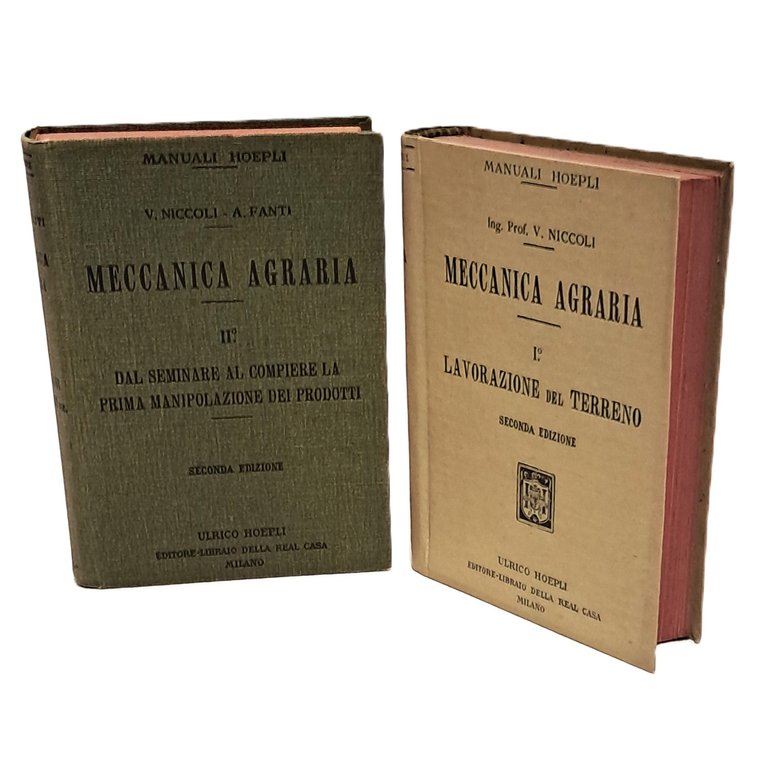 Seconda edizione riveduta ed ampliata in due volumi Manuale, il primo volume è dedicato alla Lavorazione del terreno: lavori del terreno, strumenti a mano per la lavorazione delle terre, dell'aratro e delle arature, strumenti per lavori di maturamento e colturamento, trazione funicolare e meccanica, strumenti da tiro per i trasporti, considerazioni conclusionali economiche; preceduto da un proemio sui dinamometri e sulle forze motrici in agricoltura. Il secondo volume è dedicato Dal seminare al compiere la prima manipolazione dei prodotti: Macchine e strumenti per il sollevamento delle acque per la raccolta dei prodotti, per la conservazione e preparazione dei foraggi, per trebbiare, sgranare, pulire, dicanapulare e per la conservazione dei prodotti agrari. Opera introvabile nei suoi due volumi integri. Cartonati. Con 176 incisioni (I) e 175 (II). Pp. XII+458 (I) e pp. XVI+501 (II). Ottime condizioni. Taglio in rosso.