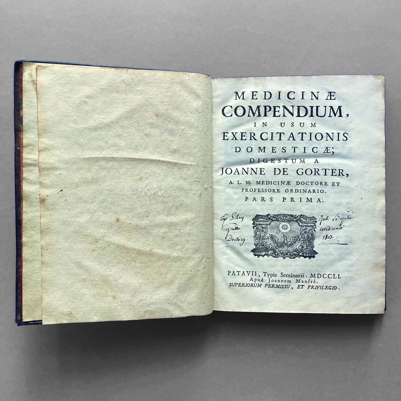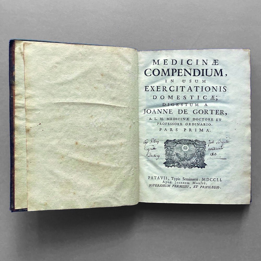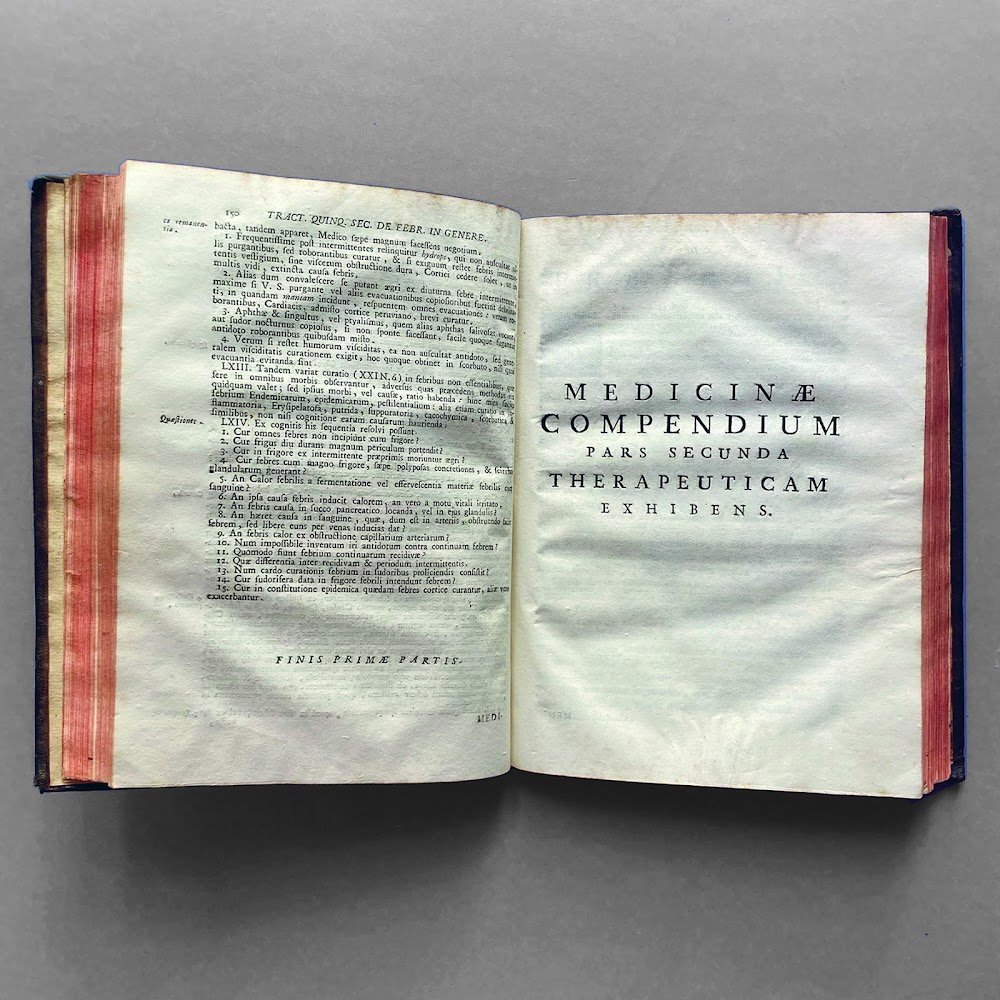 In-4°, mm 235x170, pp. (12), 1-150, (6), 153-349, (3), con due tavole incise al fondo. A carta T4 occhietto della seconda parte dal titolo: Medicinae compendium pars secunda Therapeuticam exhibens. Bella legatura in piena pelle maculata con dorso a scomparti riccamente decorati in oro, titolo su tassello. Sguardie marmorizzate, agli rossi. Mancante del ritratto dell'autore. Testatine e finalini silografici. Nota di possesso al frontespizio: Ex libris Grillo Joh. Baptista doctorij Medicina 1807. . *** TUTTI I NOSTRI LIBRI SONO VISIBILI PREVIO CONTATTO MAIL O TELEFONO NELLA NUOVA SEDE DI MILANO: LIBRERIA COSMOPOLIS, VIA JOMMELLI, 22. ***