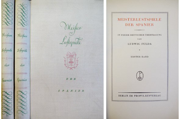 Meisterlustspiele der Spanier in freier Deustcher übertragung von. Ester Band [Lope de Vega: Die Liebesheuchler (Los amantes sin amor). Tirso de Molina: Die rivalin ihrer selbst (La celosa de sí misma). Alarcon: Das Ehemänner-Examen (El examen de maridos)]. Zweiter Band [Calderon: Das Versteckspiel (El escondido y la tapada). Rojas: Die Vertauschten Rollen (Donde hay agravios no hay celos). Moreto: Der Unwiderstehliche (El lindo Don Diego)].