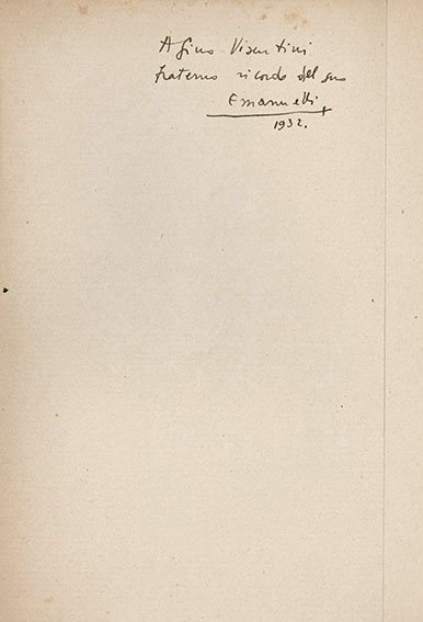 LIBROEdizione originale. CON AUTOGRAFO.Copia dello scrittore e sceneggiatore Gino Visentini, con dedica autografa dall’autore datata 1932.Non comune opera prima tirata in 639 esemplari numerati. Esordio delle edizioni della «Libra» in contemporanea con il «Baudelaire» di Mario Bonfantini, direttore della rivista. Interessante romanzo espressione del modernismo italiano del primo Novecento, tra Svevo e Moravia.Bibl.: Cicala, Le edizioni della Libra e di Posizione (in: Inchiostri indelebili, p. 255-s); Id., La formazione letteraria di Mario Bonfantini fino a “La Libra” (ibidem), p. 193-s