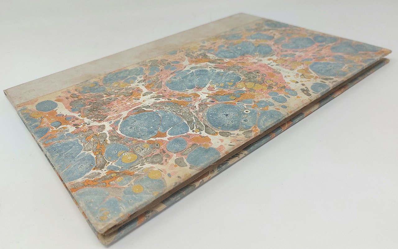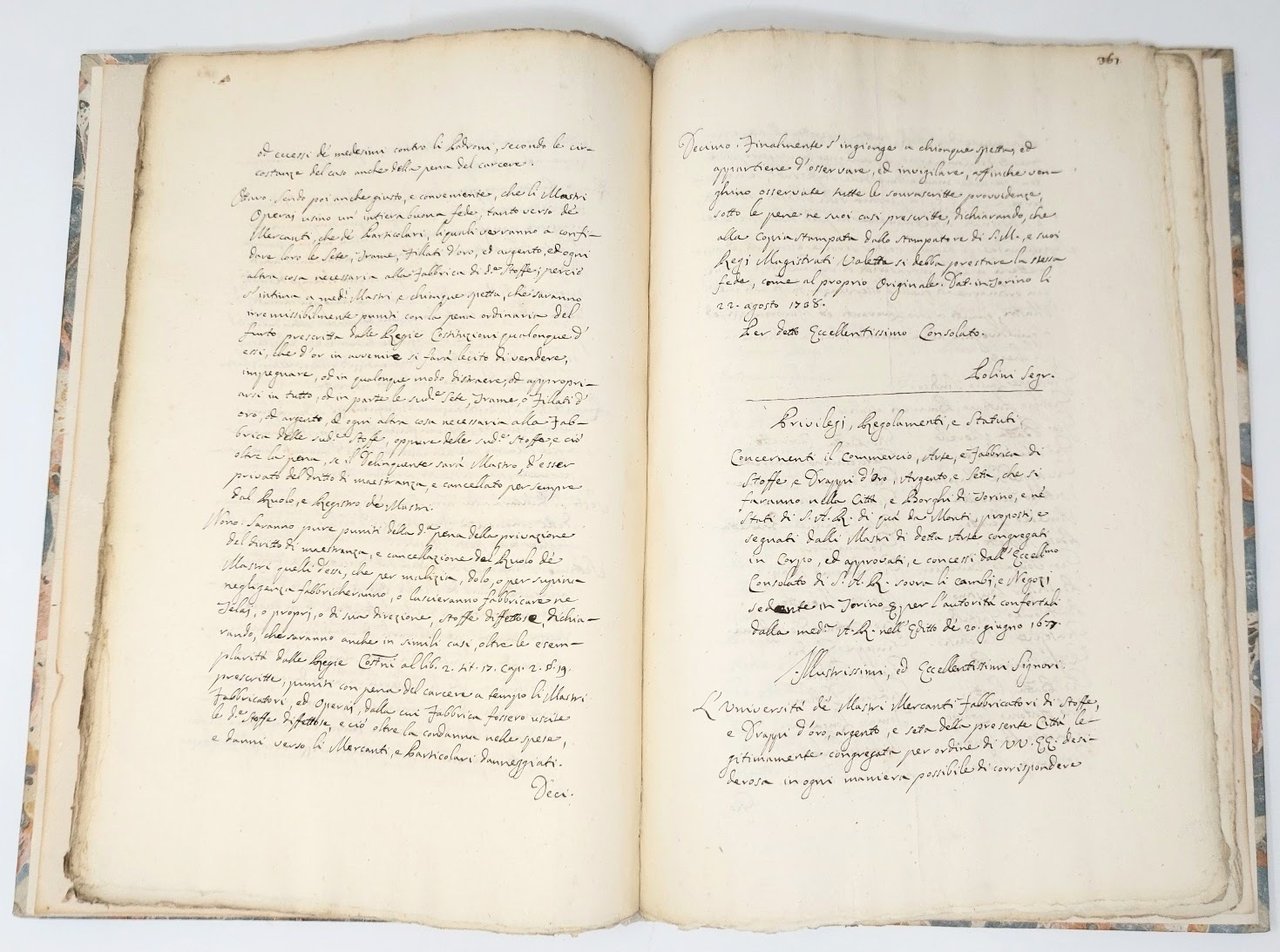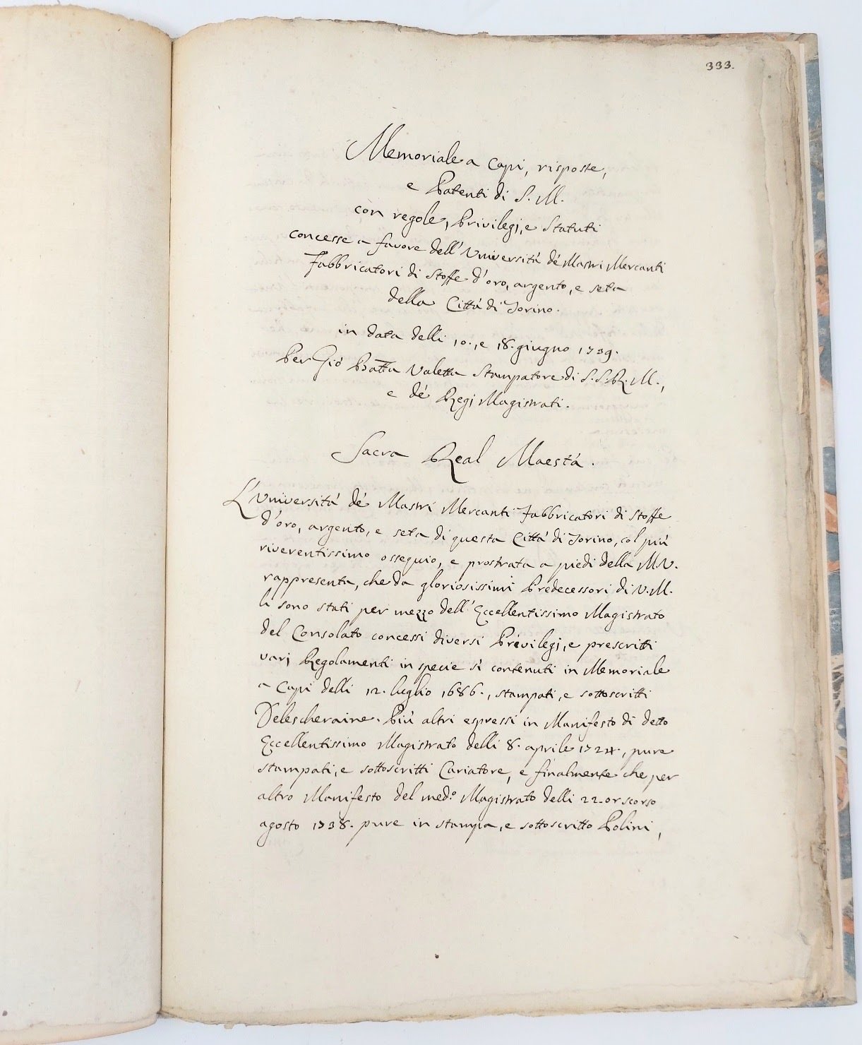 >manoscritto in-folio (mm 310X210), ff. (1b.), 56 (num. 333-389) compilati su entrambe le facciate in chiara grafia, (1 b.); leg. post. m. pergamena, carta marmorizzata ai piatti. Interessante copia, coeva alla stampa, della supplica indirizzata dall'Università dei ''Mercanti fabbricatori di stoffe d'oro, argento e seta'', al re Carlo Emanuele III. Comprende le modifiche richieste agli ordinamenti precedenti onde ''la fabbrica delle stoffe acquisti viappiù quella perfezione, che non solo renda questo Pubblico soddisfatto, ma a maggiormente ampliare, e sodamente stabilire la medesima'' e le relative risposte del Sovrano. Il manoscritto riporta inoltre tutti i privilegi e concessioni accordati dal 1686 al 1738. Stupendo esemplare.