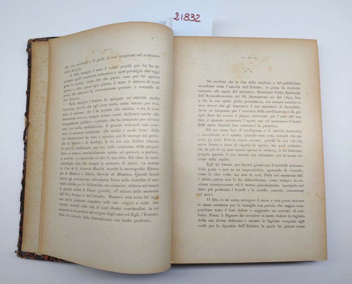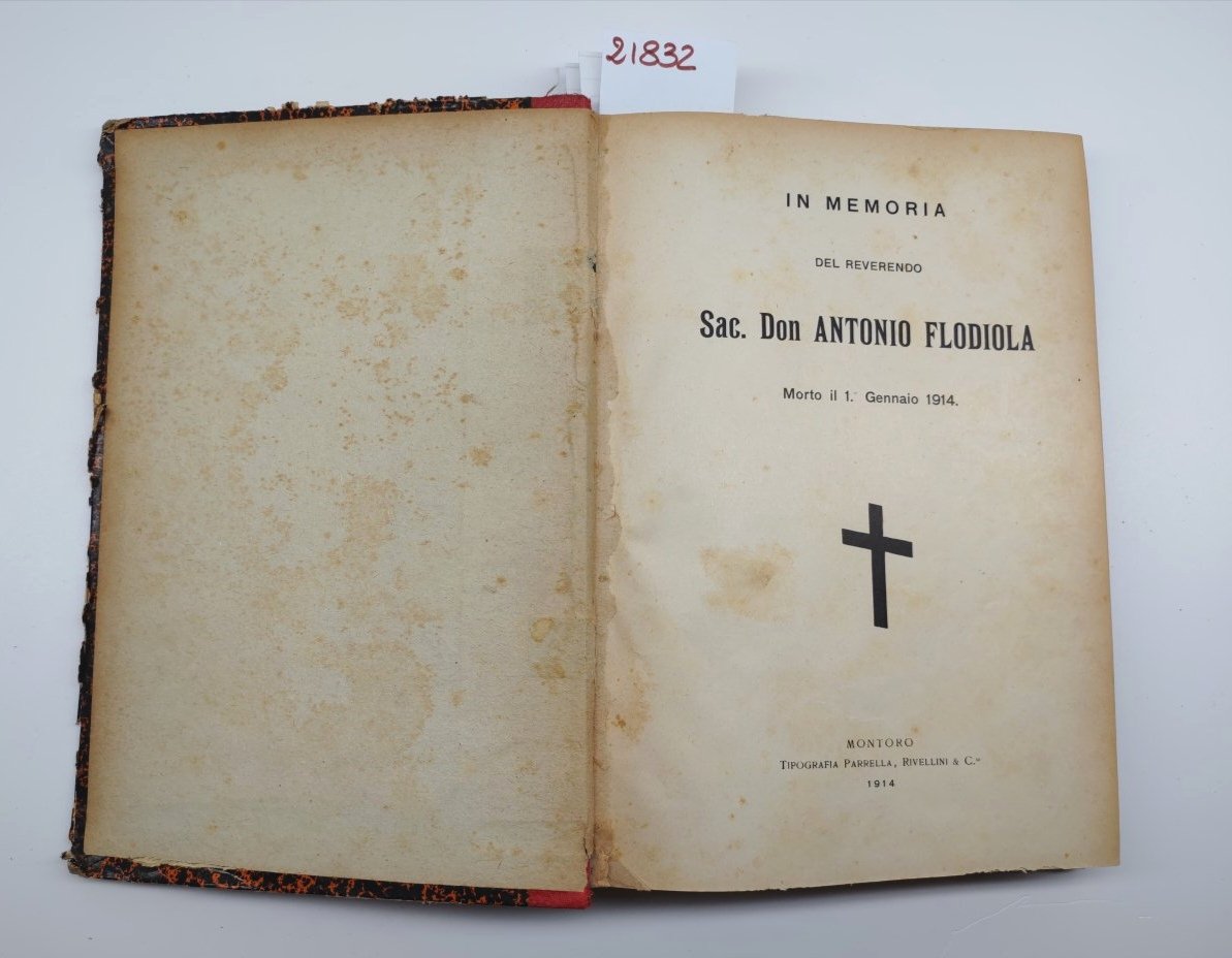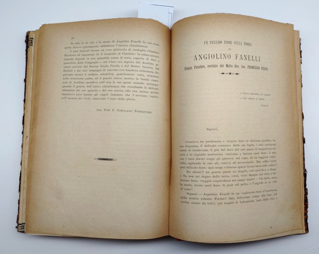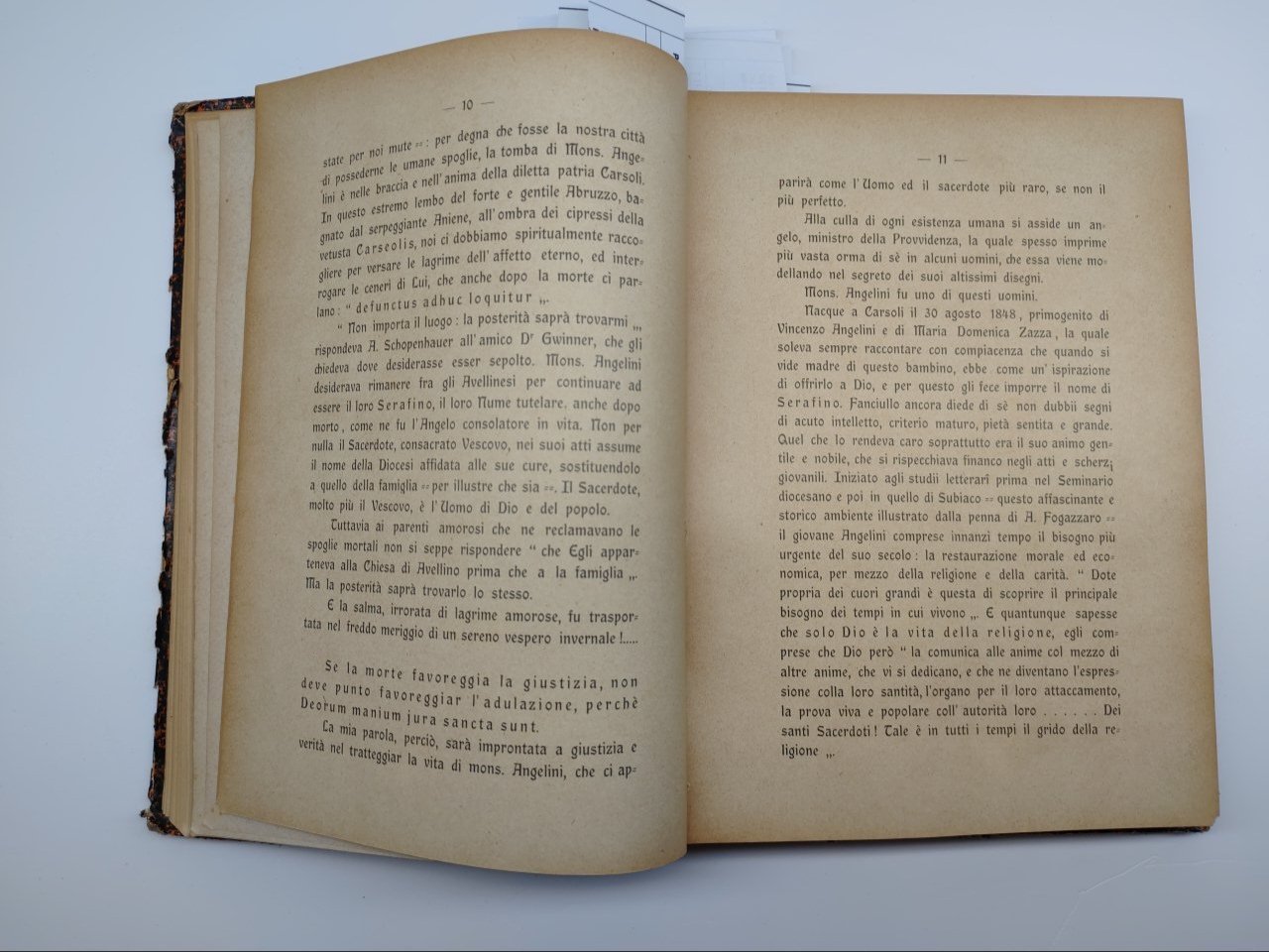legatura rigida in mezza tela con piatti marmorizzati e dorso in tela, abrasioni e mancanze ai margini dei piatti, dorso in tela rossa con abrasioni ai margini, titoli scoloriti e segni del tempo, tagli bruniti, manca la prima pagina bianca, fioriture alle pagine interne che non vanno a disturbare la lettura e brunitura al margine esterno delle pagine, tre pagine staccate dal testo in un'orazione, numero pagine 55 + 16 +107 + 43 +80 + 22 + 31 + 30, pagine di dimensioni diverse sia il margine inferiore che esterno, le 31 pagine di un necrologio sono su carta patinata con abrasioni dovuta a precedenti incollamento tra queste pagine, dimensioni cm 25 x 18