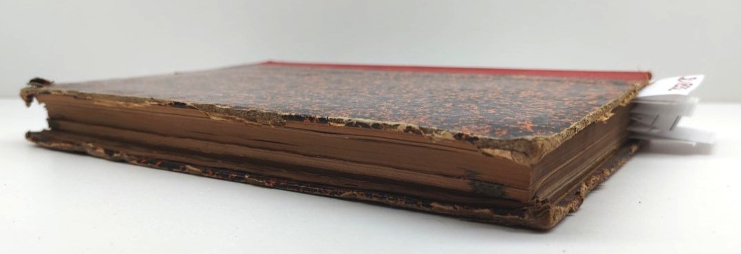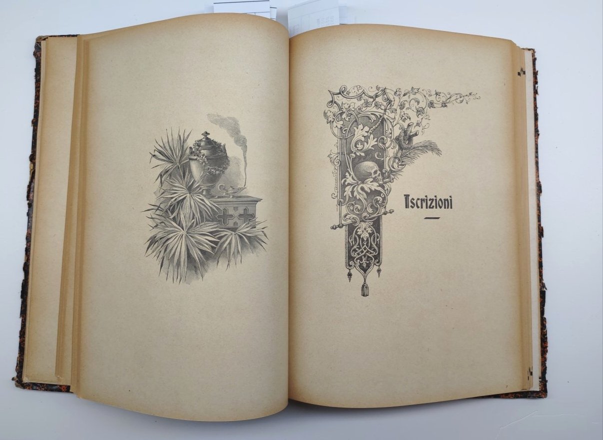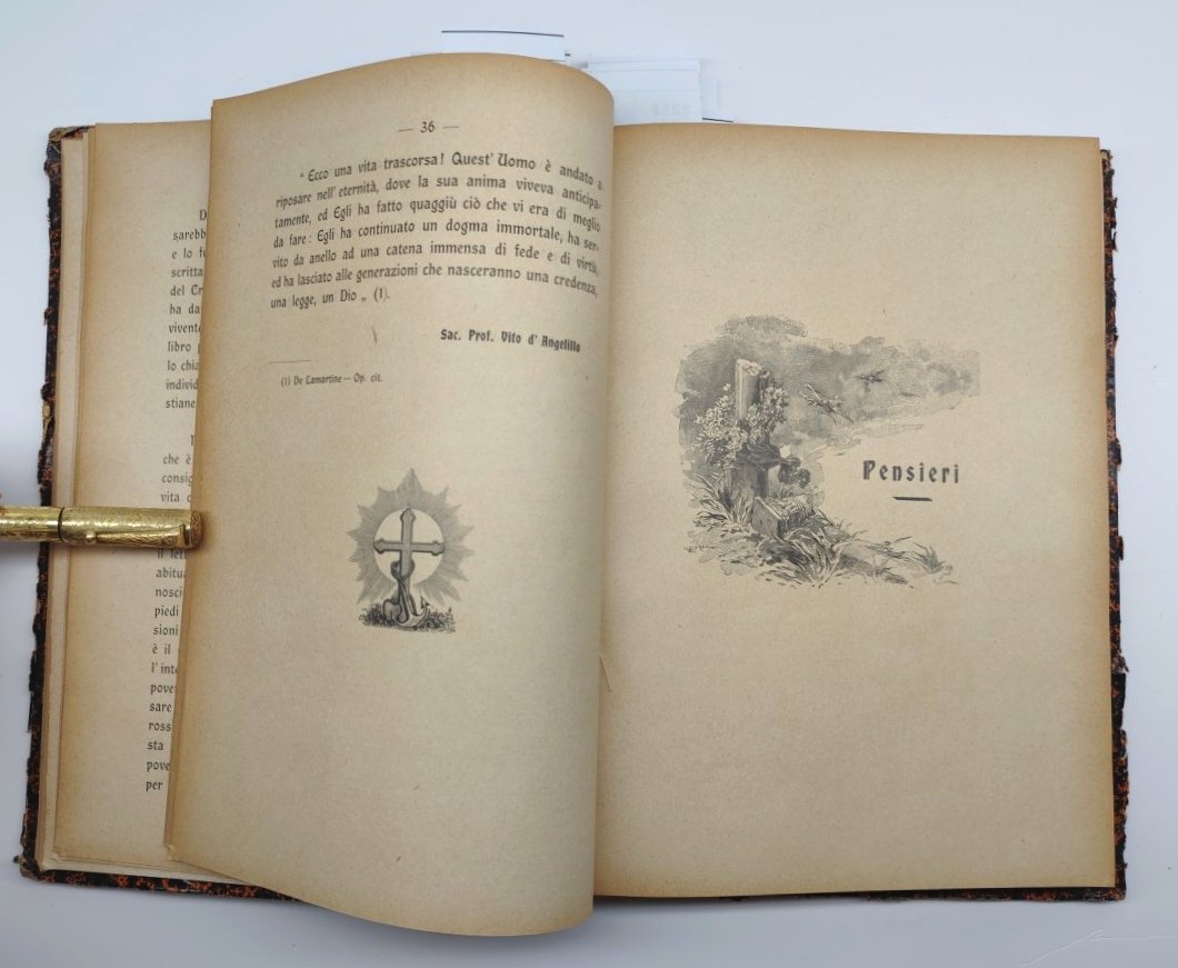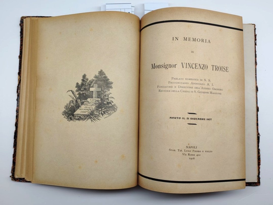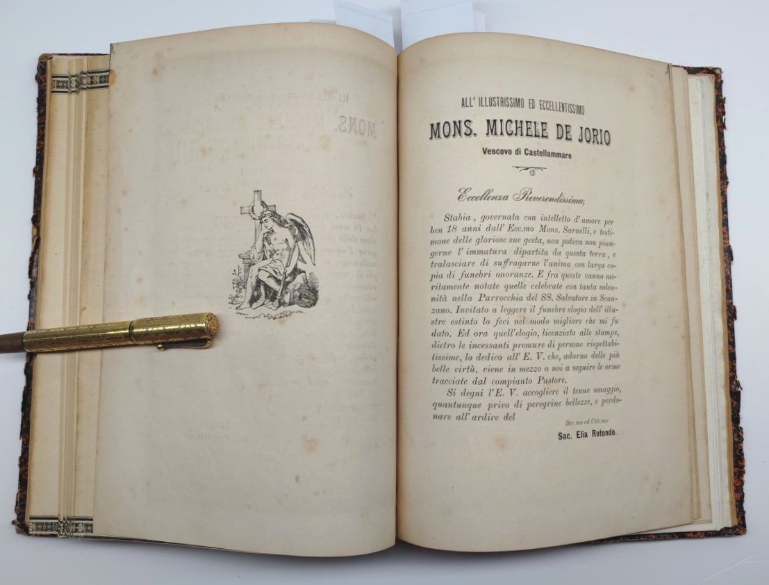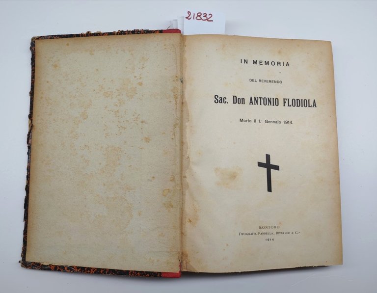 legatura rigida in mezza tela con piatti marmorizzati e dorso in tela, abrasioni e mancanze ai margini dei piatti, dorso in tela rossa con abrasioni ai margini, titoli scoloriti e segni del tempo, tagli bruniti, manca la prima pagina bianca, fioriture alle pagine interne che non vanno a disturbare la lettura e brunitura al margine esterno delle pagine, tre pagine staccate dal testo in un'orazione, numero pagine 55 + 16 +107 + 43 +80 + 22 + 31 + 30, pagine di dimensioni diverse sia il margine inferiore che esterno, le 31 pagine di un necrologio sono su carta patinata con abrasioni dovuta a precedenti incollamento tra queste pagine, dimensioni cm 25 x 18
