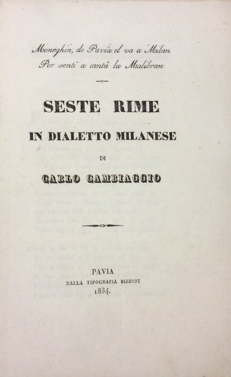 MENEGHIN, DE PAVIA EL VA A MILAN PER SENTÏ A CANTÂ LA MALIBRAN. - Seste rime in dialetto milanese.