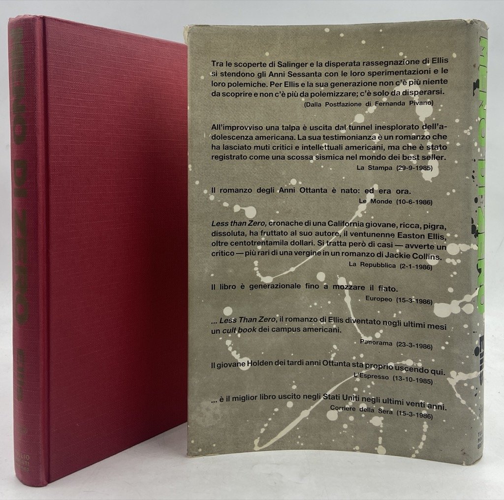 Tela editoriale con sovraccoperta illustrata, cm 22.5 x 14.5, pp 268. Lievi segni d'usura sulla sovraccoperta. Prima edizione italiana del folgorante romanzo d'esordio di Bret Easton Ellis, Less than Zero, pubblicata in memoria del drammaturgo stabiese Annibale Ruccello che ne aveva progettato una riduzione teatrale; con un saggio di Fernanda Pivano e traduzione di Francesco Durante.