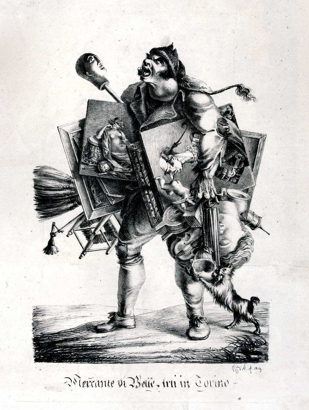 >Incunabulo litografico di Roberto d'Azeglio (Torino 1770-1862), artista di pluriforme ingegno, scrittore, pittore, caricaturista, fondatore della Pinacoteca Sabauda, illustre consigliere per le belle arti del Re Carlo Alberto. Il foglio a pieni margini misura mm 600x450 (la figura in bianco-nero 400x300): rappresenta in caricatura un mercante ambulante di antichità e oggetti vari, di brutto aspetto, sovraccarico di dipinti, strumenti, sculture, ecc. Straordinario foglio e incunabulo litografico di estrema rarità che non risulta presente nelle raccolte d'arte a Torino. In ottimo stato (alone d'umido nel margine inferiore). “Scherzo pittorico di Roberto d’Azeglio, caricaturale e ironica raffigurazione di un personaggio preda della passione per le belle arti” (in P.G.Dragone, Pittori-arte-cultura figurativa 1800-1830, p.206 con riproduz. presa dal presente esemplare). Stella, Pittura e scultura in Piemonte pp.6-12.
