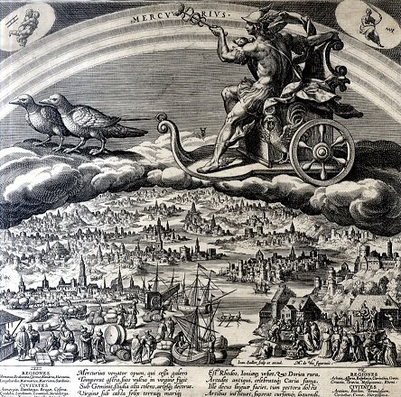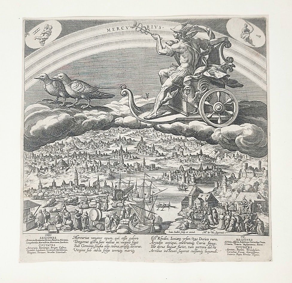 >Incisione in rame (mm 240x242), rifilata alla battuta del rame ; tratta dall'opera Planetarum Effectus et Forum in Signis Zodiaci super Provincias, Regiones et Civitates Dominia, disegnata e finemente incisa dal fiammingo Sadeler. La serie raffigura i sette pianeti come le divinità romane da cui prendono il nome, affiancati dai rispettivi segni zodiacali, mentre attraversano su carri la volta celeste, sotto alla coltre di nubi che li separa dal mondo, sono raffigurati grandi paesaggi animati con città, navi, accampamenti, figurine umane intente al lavoro. Nella presente, in alto, librato su una nuvola, il carro guidato da Mercurio. Negli angoli superiori, i segni zodiacali dei Gemelli e della Vergine. Sotto, sono disposte le 12 vedute fantastiche di 12 città fra le quali Torino il cui nome è indicato nella leggenda su quattro colonne. posta lungo il lato inferiore. Rarissima incisione riprodotta in controparte al n. 12 dell'opera di Ada Peyrot, Torino nei secoli. Bartsch, vol. 70 parte 3, n. 479.
