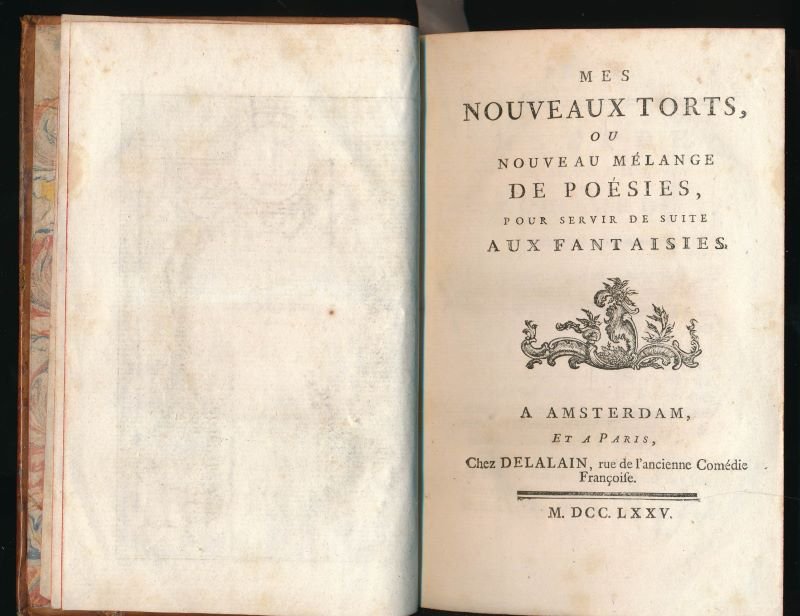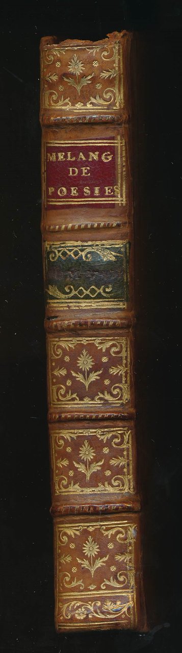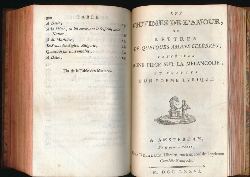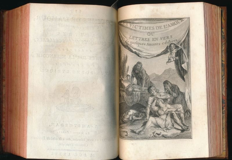 chez Delalain 1775 A Amsterdam et à Paris, chez Delalain, 1775 - 1176. In-8 relié plein-veau, dos à nerfs très orné, pièce de titre de maroquin rouge et pièce de tomaison verte. tranches rouges. Faux-titre, frontispice gravé par Mariller, titre, xvii + 300, 1 gravure. Edition originale, ornée d'un frontispice et une planche par Marillier, gravés par de Ghendt et Gaucher. Suivi de : titre, titre gravé par Mariller, 131 pages, 1 feuillet blanc, 1 gravure. Sous titre pour les victimes de l'amour : Précédées d'une pièce sur la mélancolie ; et suivies d'un poème lyrique. Léger manque à la coiffe néanmoins bel exemplaire, intérieur très frais.