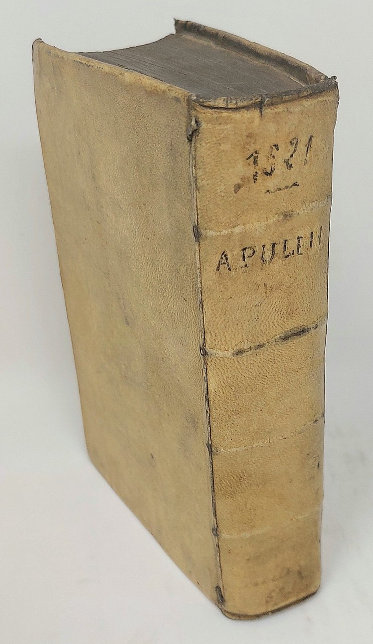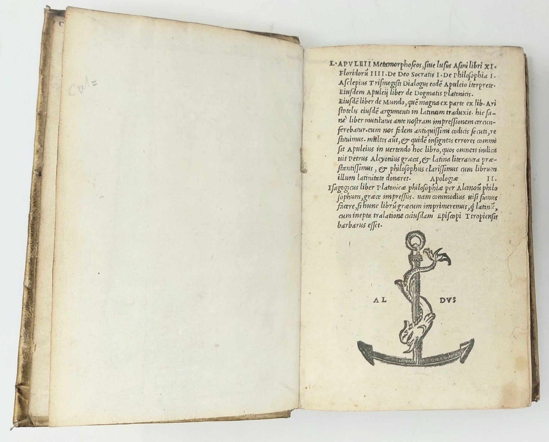 >in-8 (145x90 mm), ff. 264 (per errore l'ult. num. 266), (28), legatura secentesca in pergamena. Áncora aldina al titolo ed in fine, nitido car.attere corsivo, intermante in greco il testo di Alcinous. Dedica di Francesco Asolano, curatore dell'edizione, a Francesco Rossi, ambasciatore di Francesco I re di Francia. Prima edizione aldina della raccolta collettiva delle opere di Apuleio, che comprende la sua opera più celebre, "Asinus aureus", e vari altri trattati di filosofia platonica: "Floridorum libri IV " (raccolta di passi dei suoi discorsi), "De Deo Socratis liber I" (trattato che espone la dottrina platonica di demoni benefici intermediari tra uomini e dei), il trattato su Platone "Vita, instituta, dogmata Platonis" ed i due libri della di lui "Apologia", apprezzata soprattutto come fonte di notizie biografiche. In fine trovasi il sommario di filosofia platonica di Alcinous, ammiratore di Lucrezio, impresso soltanto in greco perché, come si avverte sul frontespizio, la traduzione latina, fatta da un certo vescovo "Tropiensis", era cosa barbara. Buon esemplare (pur con il titolo rinforzato lungo il margine esterno, macchiolina ai ff.211-214). Renouard 91.8. STC. 35. UCLA 177. Cataldi Palau 67.