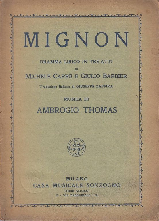 Mignon. Dramma lirico in tre atti dei signori Michele Carré e Giulio Barbier. Traduzione italiana di Giuseppe Zaffira. Musica di Ambrogio Thomas