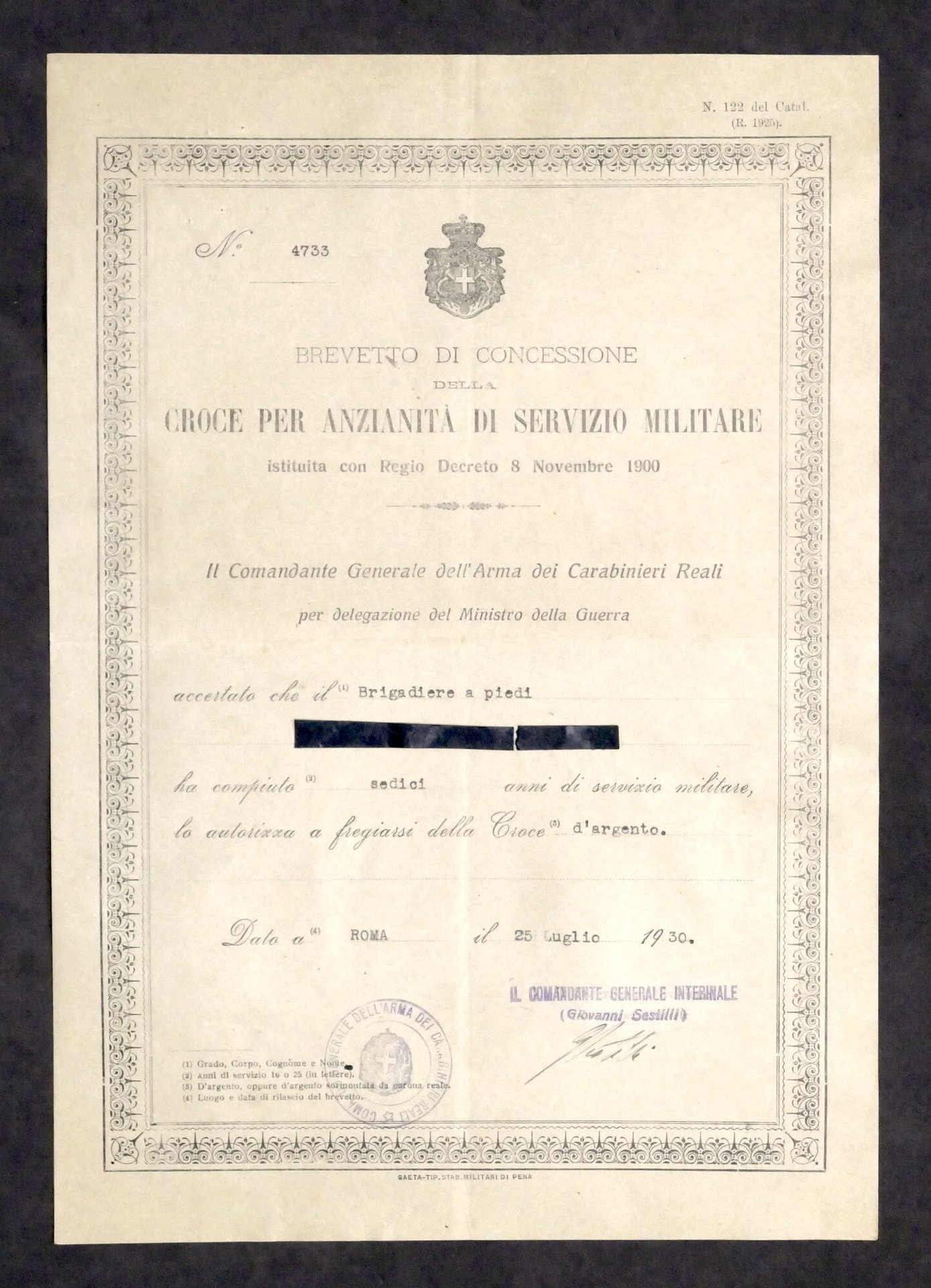 Militaria Arma Carabinieri Reali - Attestato Croce d'Argento per Anzianità 1930