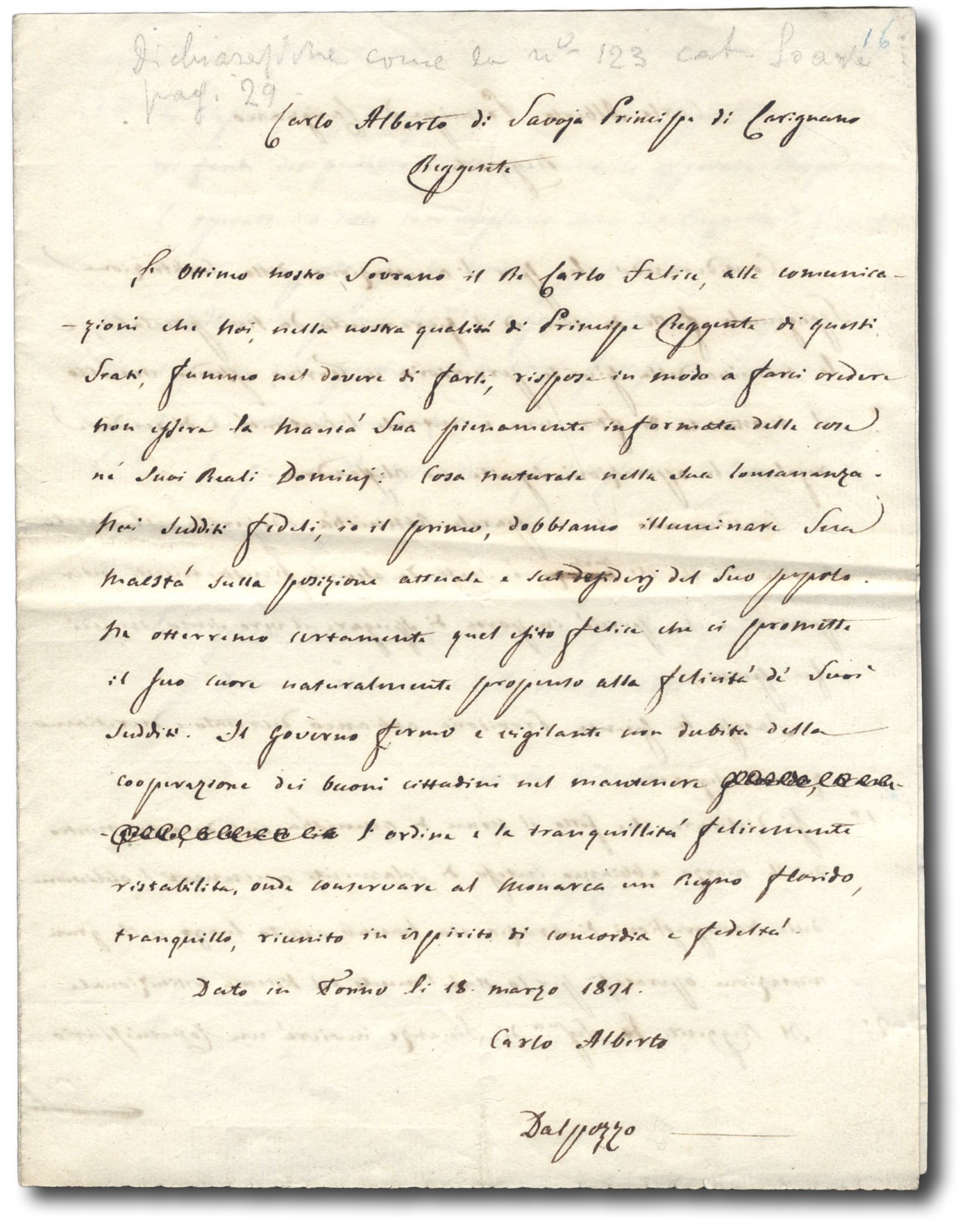 >3 pagine in-8 con cancellature e correzioni: si tratta della bozza autografa del documento dato alle stampe dalla Stamperia Reale di Torino e che Dal Pozzo compilò in qualità di Ministro degli Interni, carica che ricopriva da appena 4 giorni e che occupò nei giorni della reggenza (cioè fino al 21) e ancora nel periodo successivo all'abbandono di Torino da parte di Carlo Alberto, fino all'8 aprile, giorno in cui la giunta provvisoria torinese, che aveva fino allora governato il paese, deponeva il potere nell'imminenza dell'arrivo del generale Della Torre. ''Dobbiamo illuminare sua maestà sulla posizione attuale e sui disagi del suo popolo...il governo... non dubita della cooperazione dei buoni cittadini nel mantenere l'ordine e la tranquillità''. Seguono poi alcuni chiarimenti relativi a disposizioni sulla città di Alessandria sui concetti di amnistia, l'invio di un Commissario, promozioni militari e lo scioglimento della Giunta, il tutto a seguito delle disposizioni del 14 marzo del 1821. ''Carlo Alberto di Savoja principe di Carignano reggente Considerando che per l'accettazione della costituzione spagnuola fatta da noi, e il giuramento da noi prestato, e la nomina della giunta provvisoria in Torino, essendo venuto il momento di fare una e centrale autorità, e di rendere regolari le operazioni seguite in Alessandria''. Interessante documento storico.