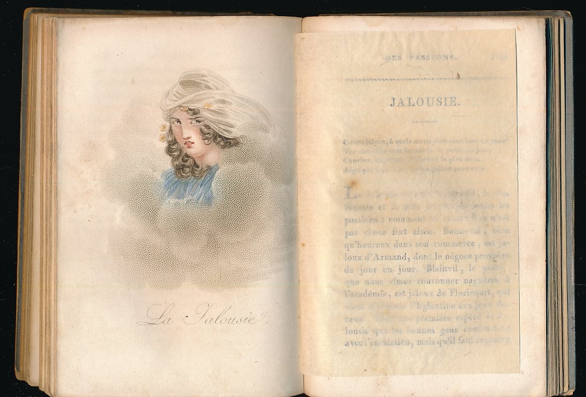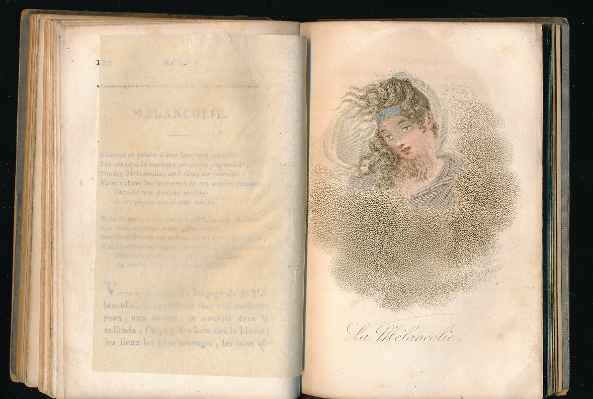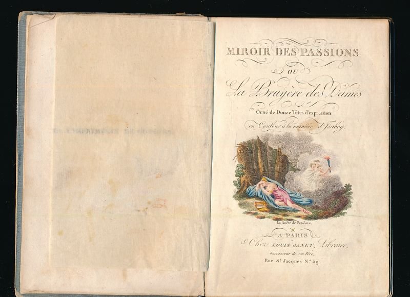 Janet 1821 Paris, Janet sans date, 1821. In-16 reliure de toile bleue de l'époque, tranches dorées. XIX + 196 pages. Orné de 12 têtes d'expression en couleurs et hors texte. Vignette couleur en page de titre. Complet du calendrier de l'année 1821 relié en fin. La reliure est abimée avec manque. Charmante étude sur les passions, illustrée par 12 planches finement coloriées : l’Innocence, la Modestie, la Malice, la Coquetterie, la Fierté, la Colère, la Compassion, la Satisfaction, la Mélancolie, la Douleur, l’Affliction, la Jalousie