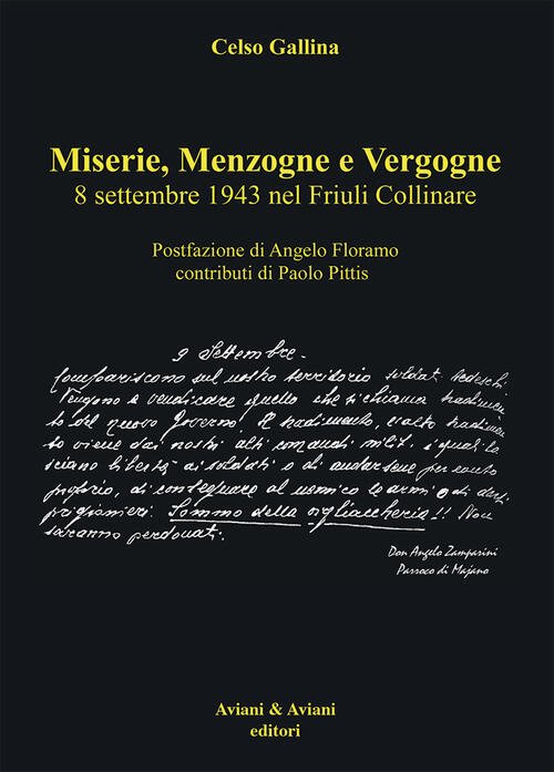 Dettagli Libro<br><br>Sku: PZZLB49673<br>ISBN: 9788877723352<br>Titolo: Miserie, Menzogne E Vergogne. 8 Settembre 1943 Nel Friuli Collinare<br>Autore: Celso Gallina<br>Editore: Aviani & Aviani Editori<br>Anno: 2022<br>Pagine: 68<br>Formato: Brossura<br><br>8 settembre 1943: una data che rievoca uno dei momenti più bui della storia italiana recente. Tanto si è scritto e tanto si è detto su quei giorni tragici che hanno coinvolto le nostre Forze Armate e la popolazione civile che, da un giorno all'altro, si sono ritrovati a non comprendere più chi fossero gli alleati e chi i nemici. Di cosa accadde nei presidi militari della pedemontana friulana, in particolare al Comando sito sul Forte di Osoppo, si sapeva invece ben poco. Il ritrovamento casuale di alcuni documenti e fonogrammi, redatti da due Ufficiali di stanza ad Osoppo, ci permettono così di alzare un velo su quei giorni di smarrimento e confusione.