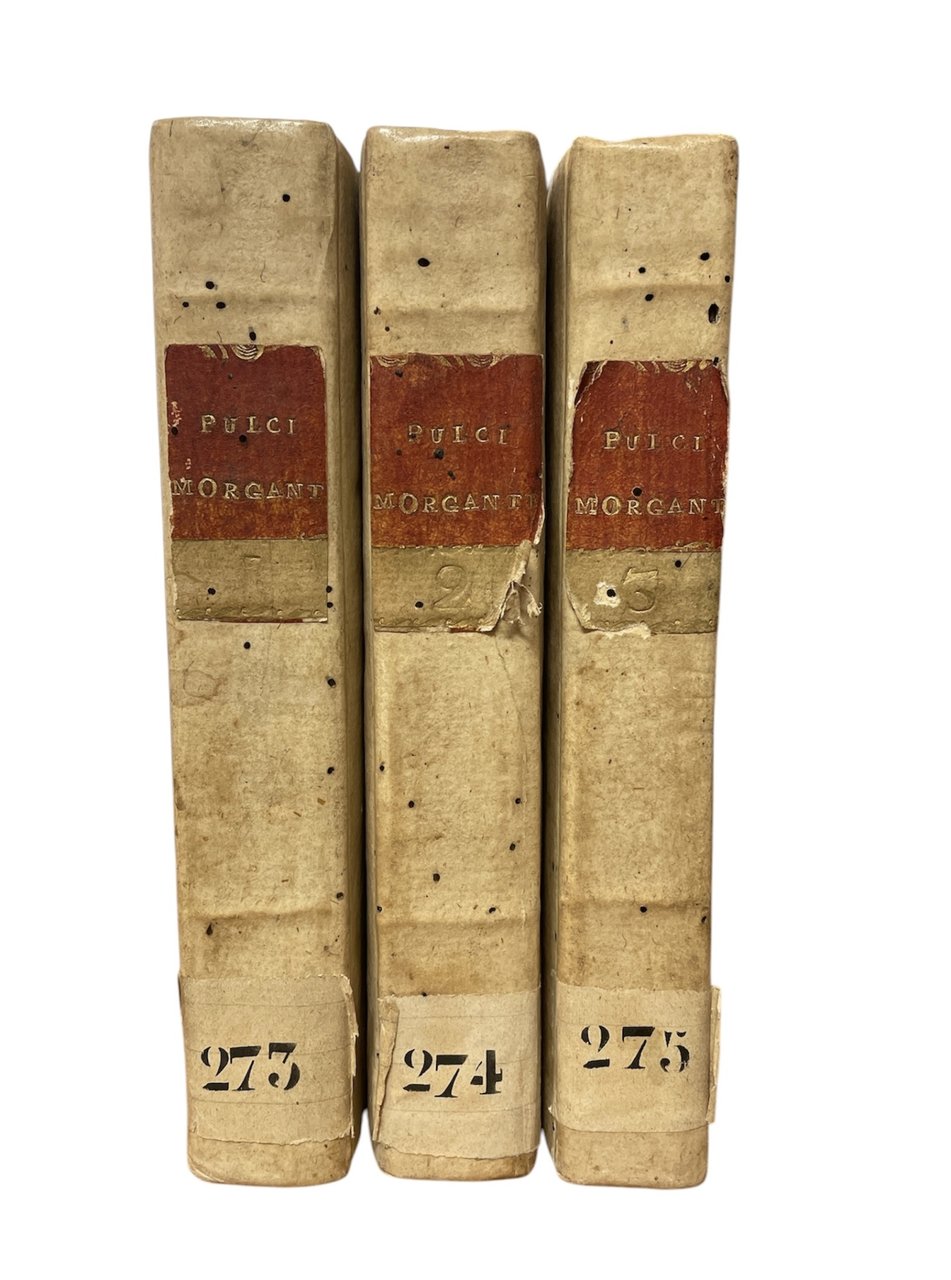 28 incisioni poste in incipit di canto di mano di Dall'Acqua, Daniotto, Zuliani e ritratto dell'autore ai tre frontespizi. in ottavo leg. pergamena rigida con titolo su tassello al dorso 3 voll. Buono (Good) Buon es..