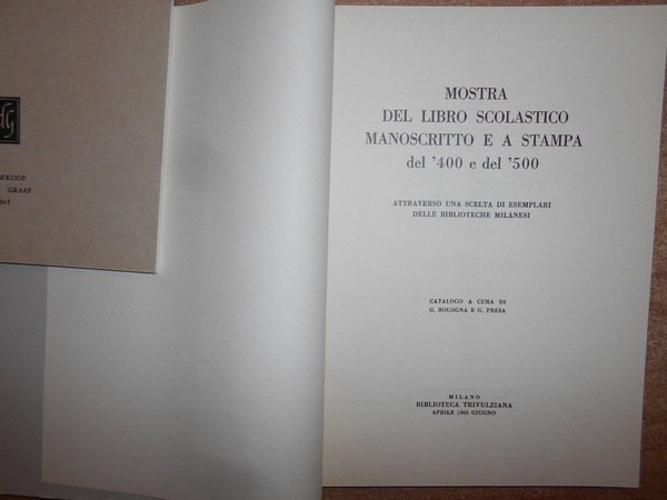 A cura di G. Bologna e G. Fresa. Milano, Biblioteca Trivulziana, 1966. Mostra del Libro Scolastico Manoscritto e a Stampa del '400 e del '500. In-8°, cartoncino edit. con risvolti. XV, 141 pp. con alcune tavole nel testo. In ottimo stato di conservazione. Uff. A - II - 3 - 2