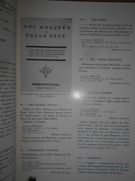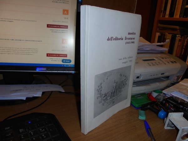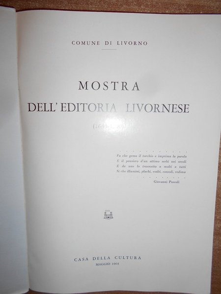 AA.VV. Livorno, Casa della Cultura, 1964. MOSTRA DELL'EDITORIA LIVORNESE (1643-1900). In-8°, 268 pp. formato 21 x 28,5. Copertina morbida illustrata di colore bianco con titoli in rosso e grigio. All'interno numerose riproduzioni di frontespizi antichi. Foglietto di errata corrige in ultima pagina. In ottimo stato di conservazione. Uff. A - II - 3 - 2