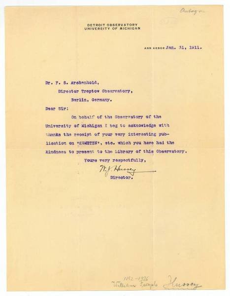 ½ S. Gr.-4to. An Friedrich Simon Archenhold, den Direktor der seit 1946 nach ihm benannten Archenhold-Sternwarte: "On behalf of the Observatory of the University of Michigan I beg to acknowledge with thanks the receipt of your very interesting publication on 'KOMETEN', etc. which you have had the kindness to present to the Library of this Observatory [.]". - Auf Briefpapier mit gedr. Briefkopf des Detroit Observatory der University of Michigan.