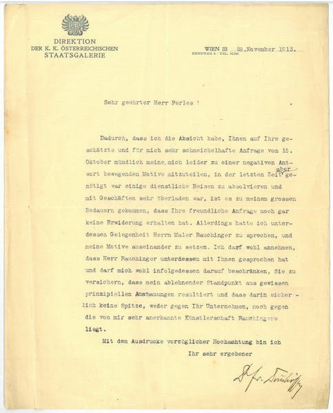 1 S. auf Doppelblatt. 4to. An den Verleger Moritz Perles in Wien: "Dadurch, dass ich die Absicht habe, Ihnen auf Ihre geschätzte und für mich sehr schmeichelhafte Anfrage vom 15. Oktober mündlich meine, mich leider zu einer negativen Antwort bewegenden Motive mitzuteilen, in der letzten Zeit aber genötigt war einige dienstliche Reisen zu absolvieren und mit Geschäften sehr überladen war, ist es zu meinem grossen Bedauern gekommen, dass Ihre freundliche Anfrage noch gar keine Erwiderung erhalten hat. Allerdings hatte ich unterdessen Gelegenheit Herrn Maler Rauchinger zu sprechen, und meine Motive auseinander zu setzen [.]". - Dörnhoffer war Leiter der Kupferstichsammlung der Wiener Hofbibliothek und wurde 1909 Direktor der neugegründeten Österreichischen Staatsgalerie. Als Nachfolger Hugo von Tschudis als Generaldirektor der Bayerischen Staatsgemäldesammlung in München tätig, widmete er sich dem Aufbau der Neuen Staatsgalerie und reorganisierte die Alte und Neue Pinakothek. - Der Verlag von Moritz Perles (1844-1917) zählte zu den "führenden Unternehmen auf dem Gebiet des Kommissions-, Sortiments- und Verlagsbuchhandels in Österreich-Ungarn" (DBE), so gab er u. a. die "Wiener Medizinische Wochenschrift", das "Centralblatt für die gesammte Therapie" und das "Österreichische Centralblatt für die juristische Praxis" heraus. In seinem Verlag erschien u. a. H. G. Wells' "Krieg der Welten". - Der erwähnte Heinrich Rauchinger besuchte die Schule der schönen Künste in Krakau, studierte dann bei August Eisenmenger und Christian Griepenkerl an der Akademie der bildenden Künste in Wien und wurde dort 1885 mit dem Spezialschulpreis, 1886 auch mit dem Rompreis ausgezeichnet. Seit 1888 als freischaffender Künstler in Wien lebend, entwickelte sich Rauchinger vom Landschafts- zum Portraitmaler und wurde 1899 Mitglied der Genossenschaft der bildenden Künstler Wiens. Zu seinen bekanntesten Gemälden gehören "Abendstimmung im Prater" (1899), "Feldblumen" (1904) sowie Portraits von Bertha von Suttner und Stefan Zweig. 1942 wurde er im Konzentrationslager Theresienstadt ermordet. Vgl. Thieme/B. XXVIII, 40f. - Auf Briefpapier mit gedr. Briefkopf.