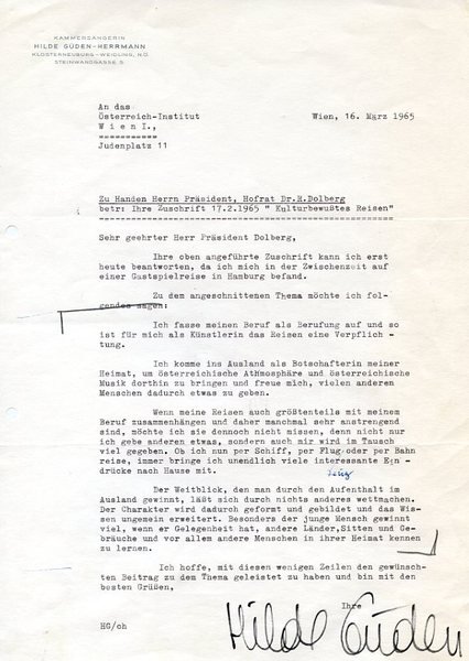 1 S. Gr.-4to. An Richard Dolberg (1888-1972) vom "Österreich-Institut" betr. dessen Anfrage zu "kulturbewußtem Reisen": "Ihre [.] Zuschrift hann ich erst heute beantworten, da ich mich in der Zwischenzeit auf einer Gastspielreise in Hamburg befand [.] Ich fasse meinen Beruf als Berufung auf und so ist für mich als Künstlerin das Reisen eine Verpflichtung. Ich komme ins Ausland als Botschafterin meiner Heimat, um österreichische Atmosphäre und österreichische Musik dorthin zu bringen und freue mich, vielen anderen Menschen dadurch etwas zu geben.Wenn meine Reisen auch größtenteils mit meinem Beruf zusammenhängen und daher manchmal sehr anstrengend sind, möchte ich sie dennoch nicht missen, denn nicht nur ich gebe anderen etwas, sondern auch mir wird im Tausch viel gegeben [.]". - Die aus Wien stammende Sängerin trat ein Jahr nach ihrem Debüt in Ralph Benatzkys Operette "Herzen im Schnee" an der Wiener Volksoper am Zürcher Opernhaus erstmals als Opernsängerin auf (als Cherubino in "Figaros Hochzeit"), gehörte von 1942 bis 1947 dem Ensemble der Münchner Staatsoper an "und feierte bei den Salzburger Festspielen 1946 einen großen Erfolg als Zerline im 'Don Giovanni'" (DBE). Später wirkte sie viele Jahre hindurch an der Wiener Staatsoper und war von 1951 bis 1960 Mitglied der Metropolitan Opera in New York. - Auf Briefpapier mit gedr. Briefkopf; im linken Rand gelocht (keine Textberührung).
