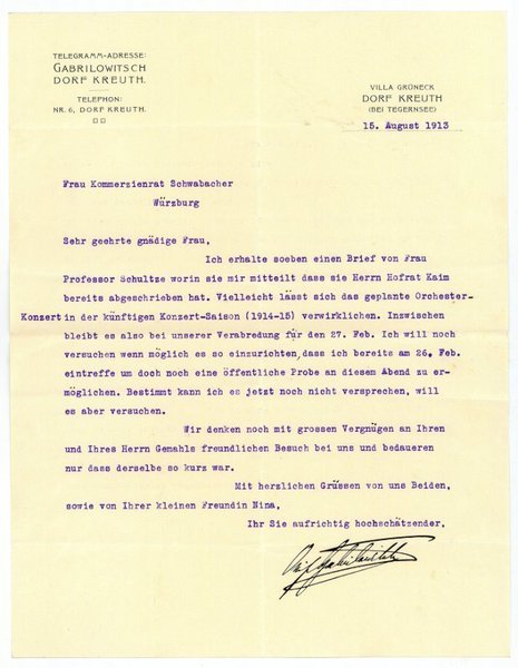 1 S. Gr.-4to. An Frau Kommerzienrat Schwabacher in Würzburg: "Ich erhalte soeben einen Brief von Frau Professor Schultze worin sie mir mitteilt dass sie Herrn Hofrat Kaim bereits abgeschrieben hat. Vielleicht lässt sich das geplante Orchester-Konzert in der künftigen Konzert-Saison (1914-15) verwirklichen [.]". - Ossip Gabrilowitsch studierte Klavier und Komposition am Sankt Petersburger Konservatorium bei Anton Rubinstein, Anatoli Ljadow, Alexander Glasunow und Nikolai Medtner und ging nach seinem Abschluß 1894 nach Wien, wo er weitere zwei Jahre bei Theodor Leschetizky studierte. Hernach als gefragter Konzertpianist weltweit tätig, wurde er 1905 von M. Welte & Söhne als einer der ersten Pianisten in deren Leipziger Aufnahmestudio eingeladen, wo er zehn Stücke für Welte-Mignon einspielte. Von 1910 bis 1914 war Gabrilowitsch Dirigent des Münchner Konzertvereins (den heutigen Münchner Philharmonikern) und ging anschließend in die USA, wo er 1918 Gründungsdirigent des Detroit Symphony Orchestra war und den Bau einer neuen Konzerthalle, die als Orchestra Hall (Detroit) verwirklicht wurde, anregte. - Auf Briefpapier mit gedr. Briefkopf.