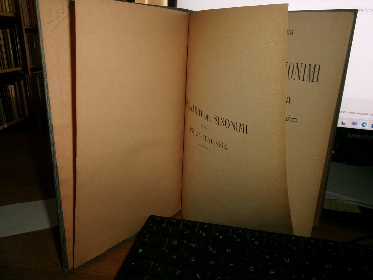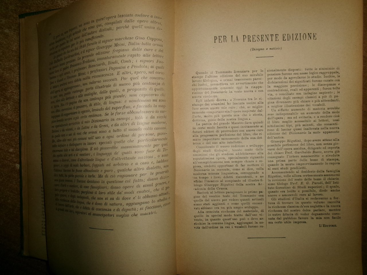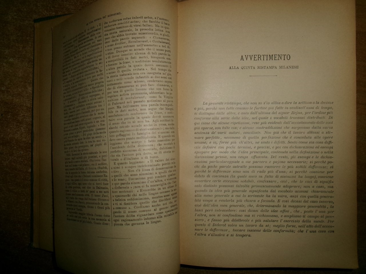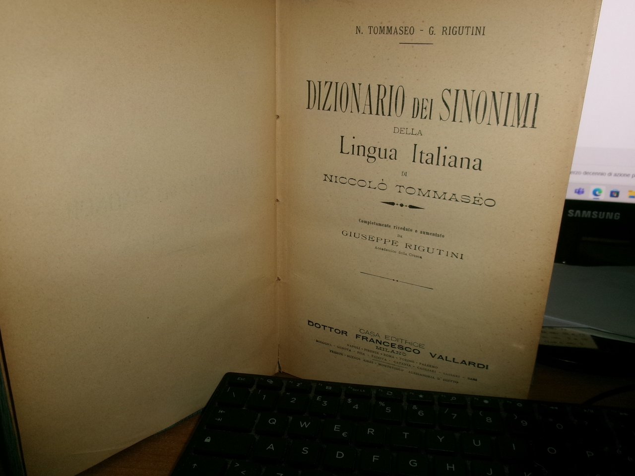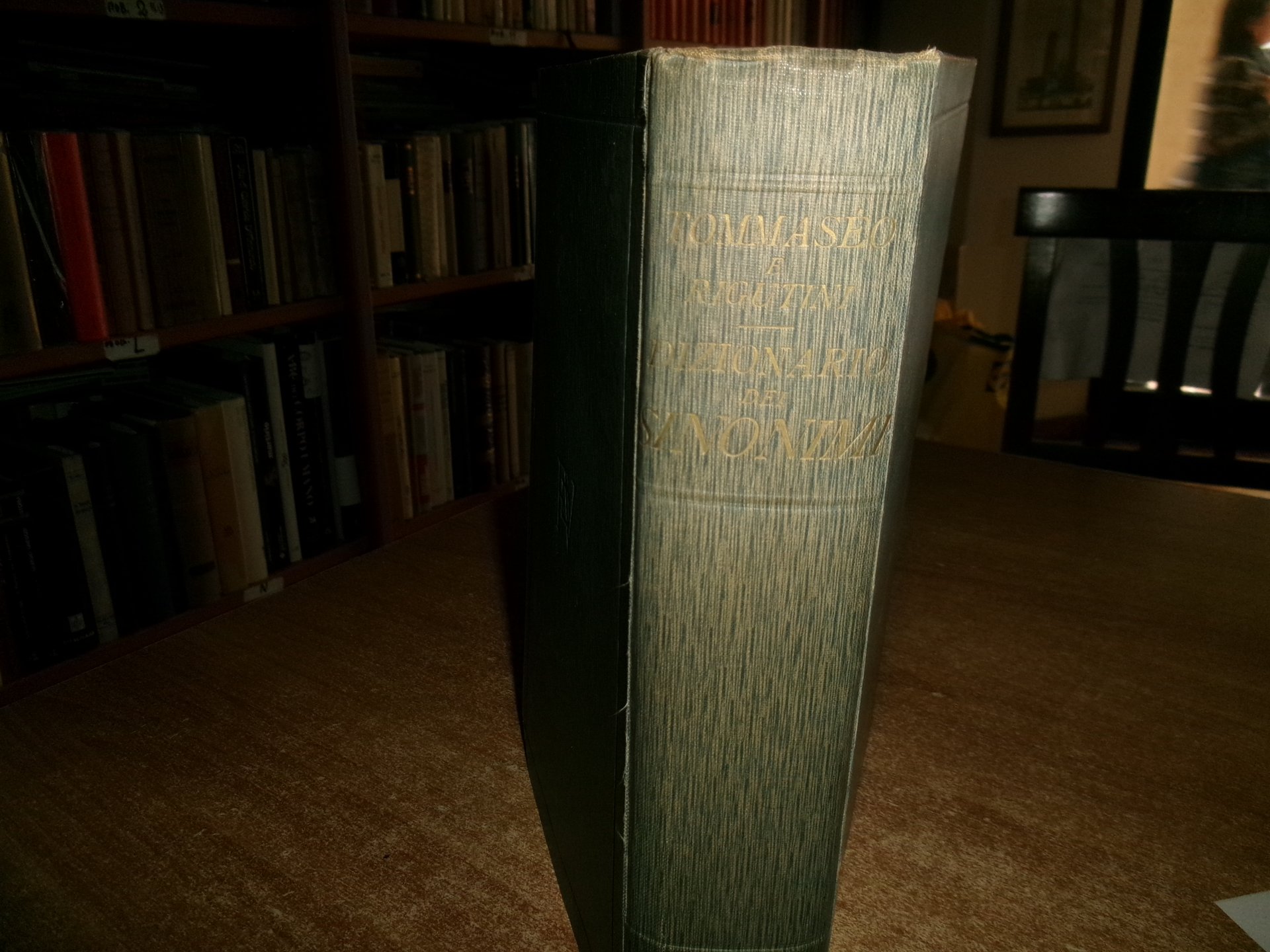N. TOMMASEO - G. RIGUTTINI. DIZIONARIO dei SINONIMI della Lingua Italiana di Niccolò Tommasèo. Completamente riveduto e aumentato da Giuseppe Rigutini Accademico della Crusca. 5a Edizione. Milano, Casa Editrice Francesco Vallardi s.d. (1860 ca.) In-8°, tela edit. orig. con titolo in oro sul dorso. LVI, 1000 pp. Esemplare ben conservato con normali segni del tempo. Neg. mob. rosso