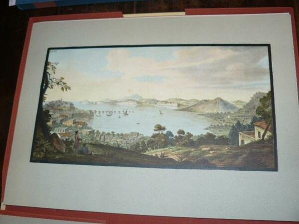 In-folio, pp. 16 e 20 artistiche tavole, alcune varie volte ripieg. e a colori che riproducono antiche incisioni, disegni e tempere di importanti vedute e costumi della Napoli antica, custodia editoriale in tutta tela in cofanetto in cartone. Tiratura limitata a 200 esemplari.