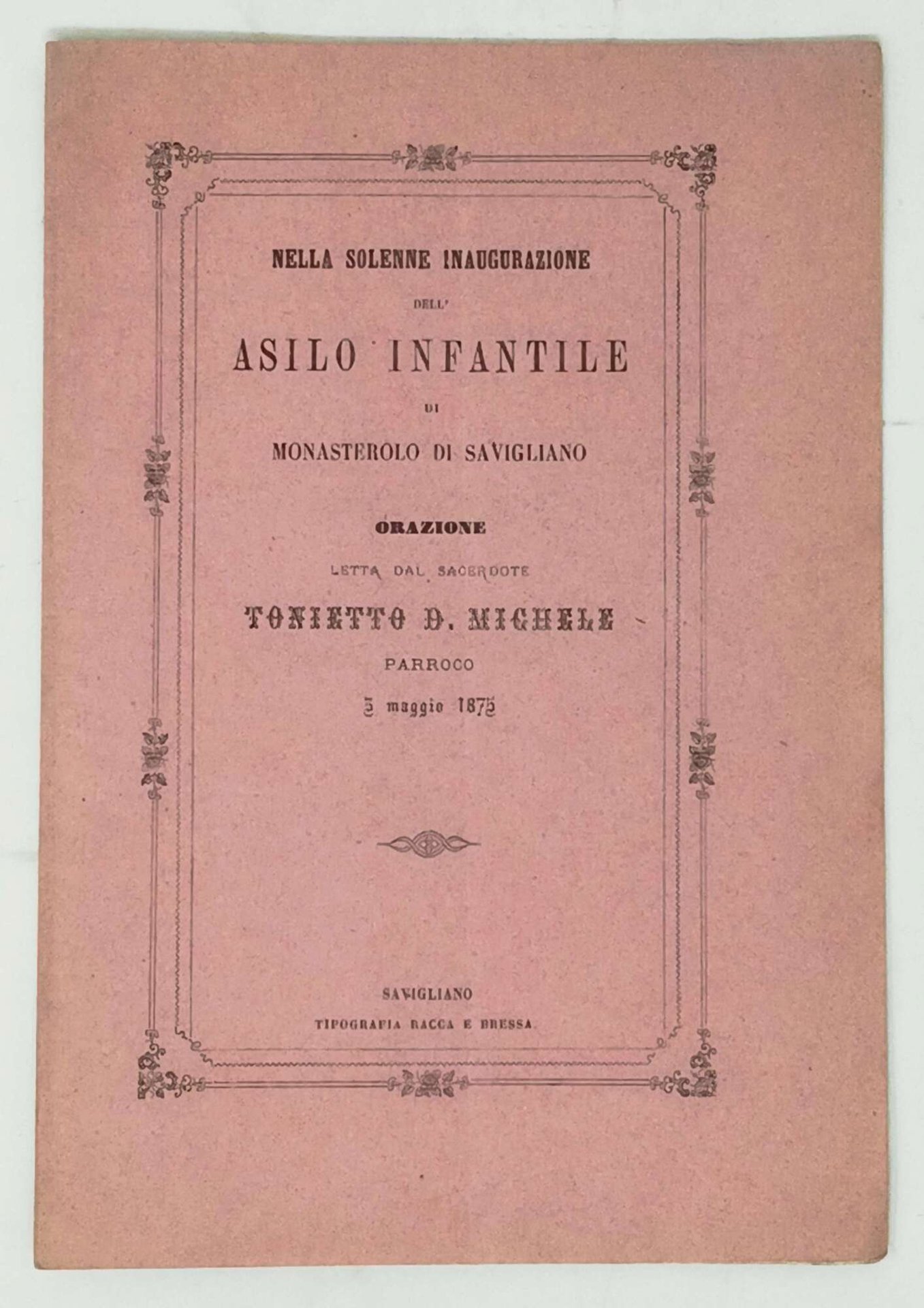 >in-8 (mm 205 x 143), pp. 15, brossura editoriale, al piatto superiore cornice finemente decorata con titolo e dati tipografici all'interno. Orazione letta dal sacerdote Tonietto in occasione dell'inaugurazione del ricovero per bambini le cui basi furono gettate dalla benefattrice Andreis Di Cimella Contessa Tarsilla. Esemplare in ottime condizioni, raro.