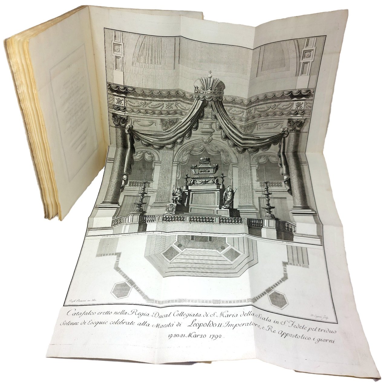 >in-4, pp. XXI. Legato con Inscriptiones appositae ad Pompam Funebrem, (2), IV, leg. cartonato rustico. La prima parte è adorna di una vignetta allegorica al titolo incisa da D.Cagnoni, di una testata allegorica con effigie del sovrano inc. da Mercoli, e di una grande iniziale istoriata inc., il tutto dai siegni di Andrea Appiani; il testo è compreso da riquadro di filetti. La seconda parte è corredata da una grande tavola più volte ripieg., raffigurante il “Catafalco eretto nella Regia Ducal Collegiata di S. Maria della Scala in S. Fedele”, inc. dal Cagnoni su disegno di Giuseppe Piermarini. Bell'esemplare. Predari, p. 212.