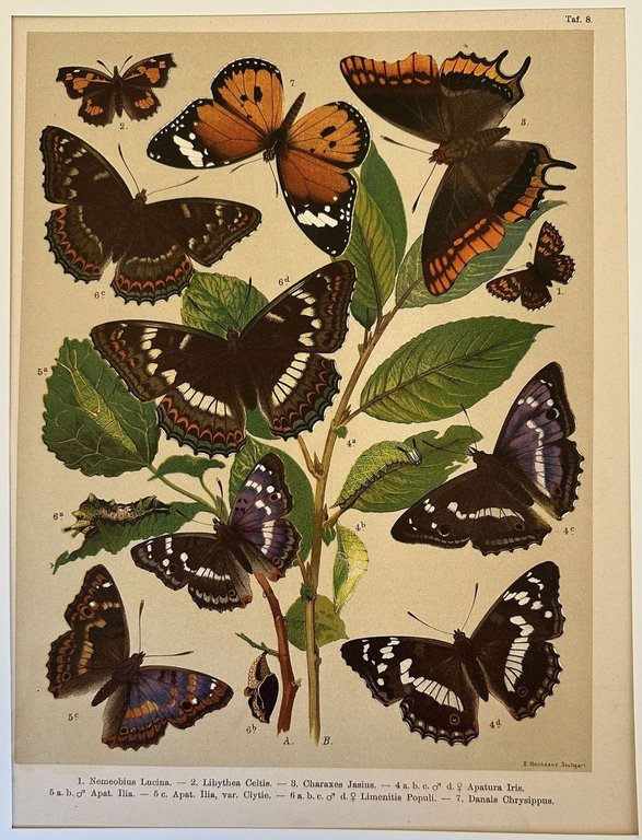 Nemeobius lucina - Libythes celtis - Charaxes jasius - Apatura iris - Apat. ilia var. Clytie - Limenitis populi - Danais Chrysippus<BR><BR>
