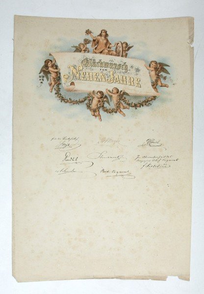 12 Bll., zumeist mit hübschem Blattschmuck in goldgehöhter (Chromo-)Lithographie sowie farbiger Kalligraphie, mit rund 600 Unterschriften. Dem Generaldirektor der österreichischen Staatsbahnen, Leopold Bresson, zum Neujahrsfest 1865 gewidmet von seinen Beamten. Unter den Widmenden finden sich z. B. auch August Köstlin (1825-94), als Leiter des Brückenbaubüros "bahnbrechend in der Verwendung künstlerischer Motive" (ÖBL IV, 51), und Carl Ruppert (1813-81), Baudirektor der Staatseisenbahn, dessen Bauwerke für das sog. Ergänzungsnetz "die damals höchste Anerkennung fanden" (ebd. IX, 330). Die einzelnen, teils prächtig ankolorierten, goldgehöhten und kalligraphierten Schmuckblätter sind jeweils von einer Direktionsabteilung oder Sektion dediziert (Baudirektion, Domänen-Direktion, Buchhaltung, Werkstätten etc.). - Der französische Ingenieur Louis-Léopold Bresson hatte zuvor an der Errichtung der russischen Staatsbahn mitgewirkt und war dann zur (seit Mitte der 1850er Jahre immer stärker unter die Hoheit französischer Investoren, aber auch fähiger Pariser Ingenieure geratene) österreichischen Staatseisenbahngesellschaft gewechselt, wo er von 1863 bis 1877 als Generaldirektor wirkte. - Kleine Randläsuren; teils leicht angestaubt. Kleine Wurmgänge.