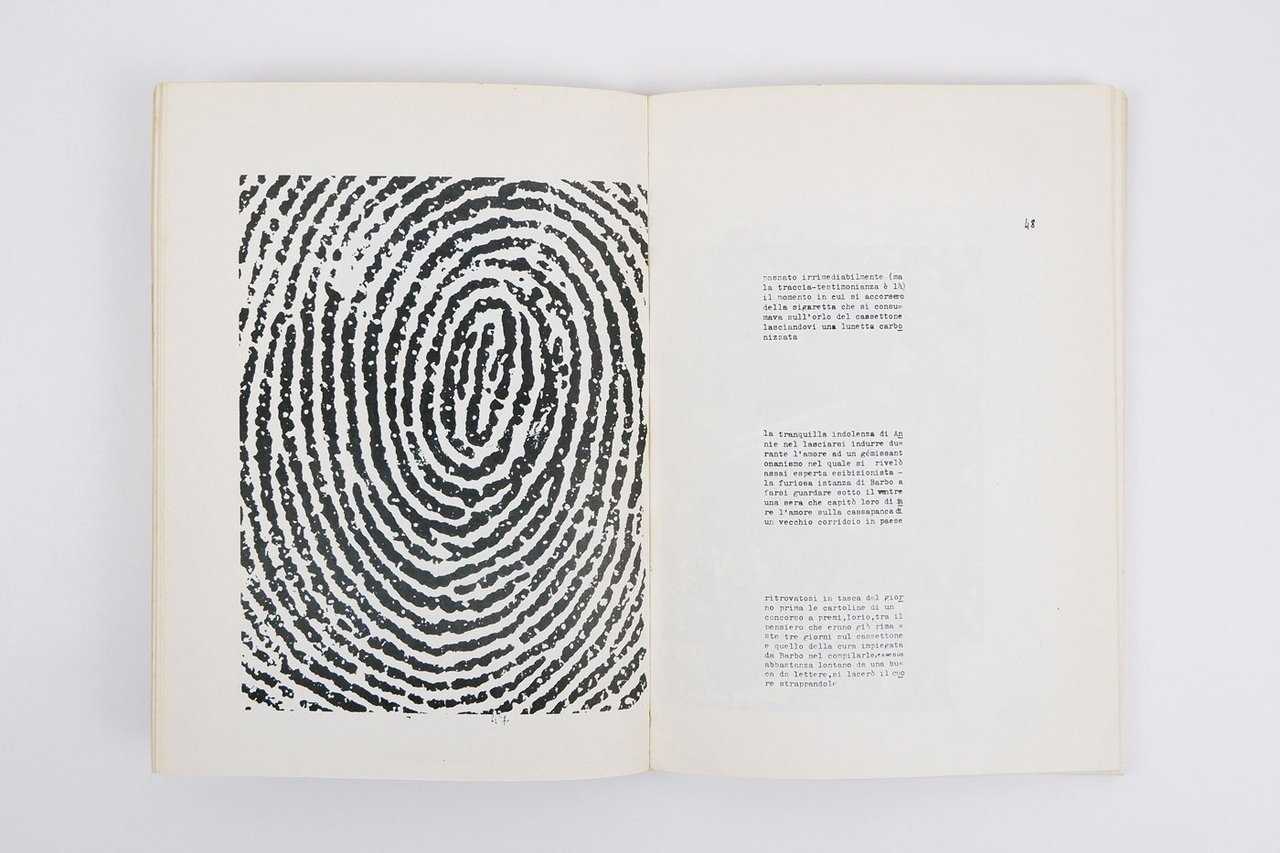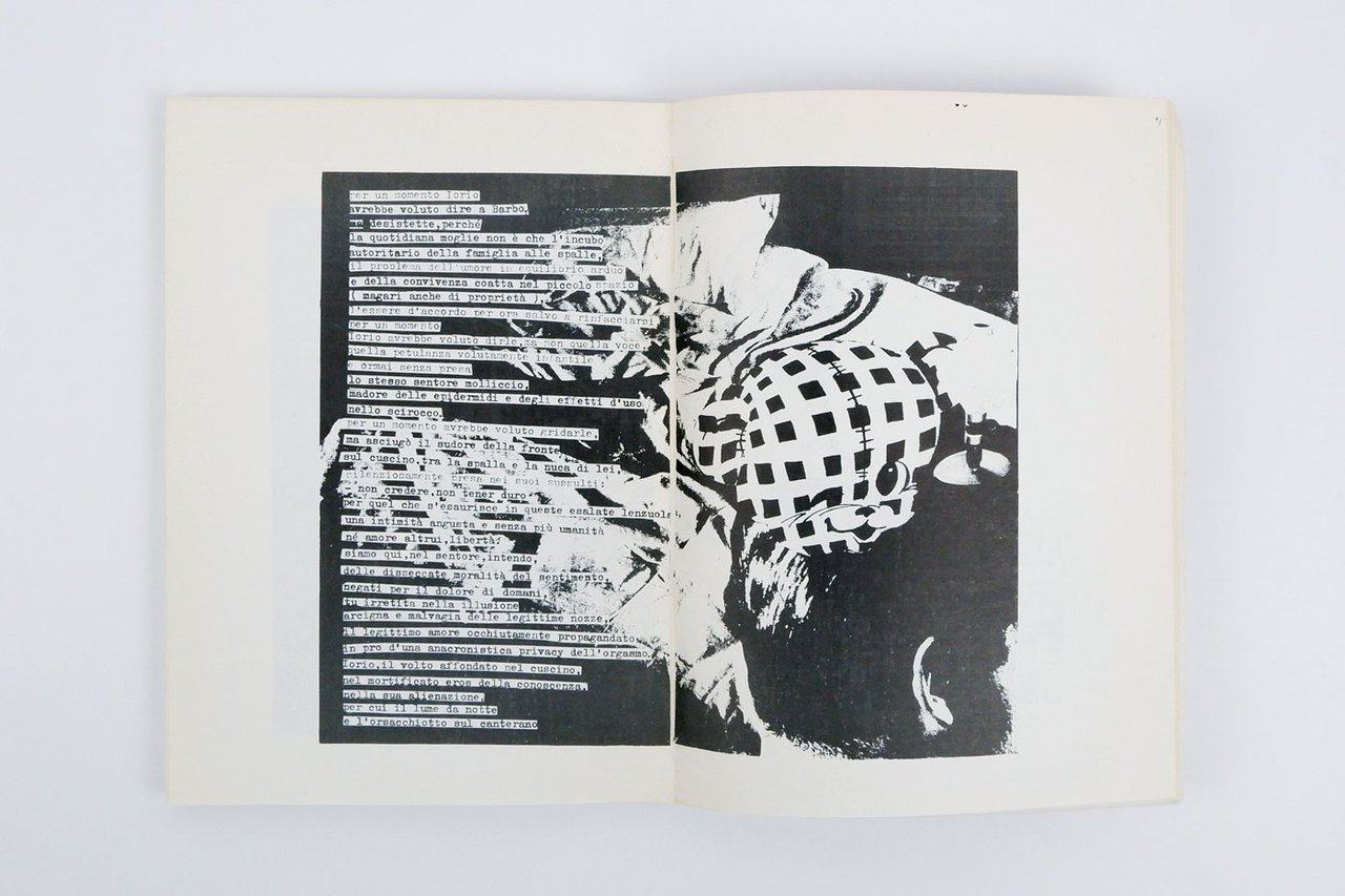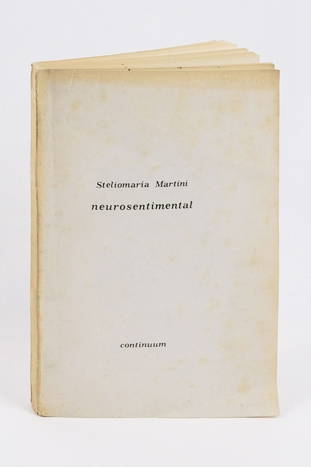 LIBROEdizione originale.CON AUTOGRAFO.Esemplare numero 40 di soli 100 numerati e firmati in autografo dall’autore al colophon, proveniente dalla biblioteca personale di Emilio Piccolo, collaboratore di Caruso e Martini all’epoca di «Continuum» e «Continuazione»; scurito al dorso e fiorito al piatto superiore della copertina, con un paio di gore; interno fresco e pulito.Rarissimo libro d’artista, censito in soli tre esemplari in ICCU (Archivio Luciano Caruso, Firenze; ASAC Venezia; PAN Napoli), e mancante a molte istituzioni specializzate nella raccolta di materiali della poesia visiva e concreta (per esempio la Fondazione Berardelli, a dispetto di quanto registrato da Bazzini e Gazzotti in occasione della mostra «Controcorrente», registra in biblioteca la sola edizione Morra del 1983). «Neurosentimental», la prima opera “narrativa” dell’autore, è unanimemente considerato capostipite e punto di partenza per le ricerche verbo-visuali nel secondo Novecento. Fu tirato in soli 100 esemplari numerati e firmati al colophon, evidentemente manufatti con tecniche di riproduzione primitive (rotocalco) e rilegati tramite incollatura a pressione in una spoglia brossura bianca (ad eccezione del piatto superiore con «Steliomaria Martini | neurosentimental | continuum»). -- La datazione dell’edizione è incerta. Il volume si presenta senza data alcuna eccetto quanto appare nel colophon, in terza di copertina: «Steliomaria Martini | NEUROSENTIMENTAL | (1963) - Ed. continuum | in cento copie numerate | a mano e firmate». Tuttavia è noto che l’esperienza di Continuum si sviluppa nei pressi del 1970, poco prima (1967/8-1970) e poco dopo (1972-1974/5) e proprio una parte di «Neurosentimental» apparirà in pre-originale su «Linea Sud» 5/6, aprile 1967. Quella che è certa è la data apposta in calce alle tavole, tutte firmate dall’autore «martini ’63», ed è pure ben noto che Martini andò elaborando nel 1963, sulla scia dei poemi-collage dell’opera prima poetica «Schemi» (Napoli: Documento Sud, 1962) — «considerato una pietra miliare della poesia visiva» (Caserta in Maffei e Peterlini, Riviste d’arte d’avanguardia, Milano 2005, p. 165) — i due altrettanto mitici romanzi-collage: «Neurosentimental» e «Formulazioni non-A», che sono tra loro legati a doppio filo, entrambi pubblicati dalla sigla «continuum» con le medesime indicazioni editoriali al colophon (ma «Neurosentimental» è l’“opera” vera e proprio, un tomo di 150 e più pagine, mentre «Formulazioni» ne risulta praticamente un’appendice di una ventina di pagine). -- «Un’opera per certi versi addirittura mitica nell’ambito della più segreta, e spesso clandestina, avanguardia italiana. E la cui vicenda è parallela a quella dell’autore. Il libro, infatti, è del 1963, ne apparvero alcune pagine su riviste, ne fu annunziata la pubblicazione da Lerici, ce ne fu poi un’edizione che Martini definisce “impraticabile” e in soli cento esemplari, a cura del gruppo Continuum. Un’opera, dunque, importante ma quasi del tutto ignota […]. Neurosentimental, dunque. Ovvero il tentativo, fatto all’inizio degli anni sessanta, di realizzare un romanzo visivo che tiene conto — in maniera esplicita — dell’esperienza delle avanguardie storiche, in primis il surrealismo, collegandola a un discorso, già allora urgente, sull’immagine. [….] Vi è insomma in Martini il tentativo, tutt’altro che casuale, di passare già allora […] dalla “grammatica” della scrittura visiva alla “sintassi”. Tentativo non solo in anticipo sui tempi, ma destinato anche, in buona sostanza, a rimanere solitario e isolato. E non è ozioso domandarsi quale influenza avrebbe potuto avere l’opera di Martini sull’esperienza complessiva dell’avanguardia se “Neurosentimental” fosse stato pubblicato nel 1963, quando cioè la neo-avanguardia italiana “ufficiale” faceva le sue prime, rumorose prove» (F. Piemontese, «Rebus di parole e immagini», recensione apparsa sul «Mattino» del 16 giugno 1983 alla seconda edizione Morra di «Neurosentimental»).L’impassibile naufrago: Le riviste sperimentali a Napoli negli anni ’60 e ’70, pp. 107-125, img. n. 90; Poesia visiva 1963-1988: 5 maestri, p. 461s; Bazzini e Gazzotti, Controcorrente (Torino 2011), pp. 19, 45 e 92 (con data 1974);