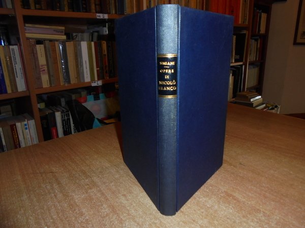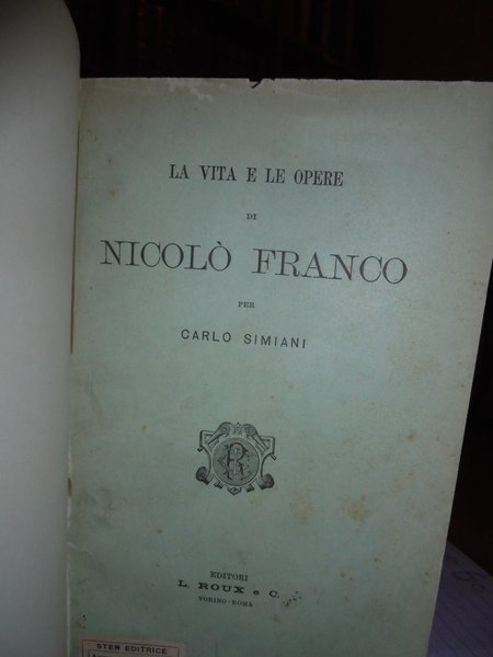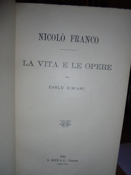 Carlo, Simiani. Torino-Roma, L. Roux e C., 1894. Nicolò FRANCO. La vita e le opere. In-8°, tela edit. con titolo in oro al dorso, copertine originali conservate. 173, (5) pp. Ottimo esemplare il legatura recente. Uff. E - II - 3 - 2