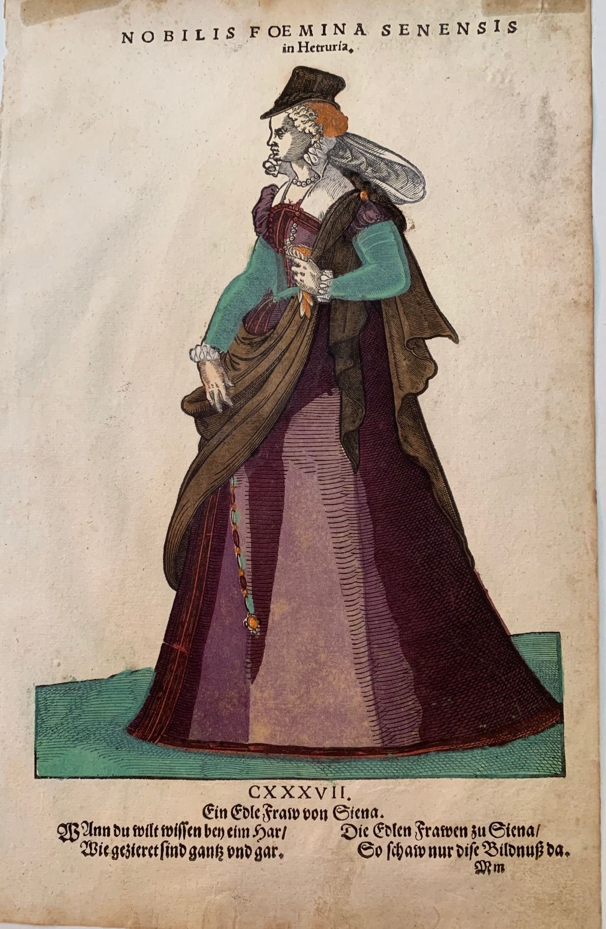 >Silografia originale, foglio di mm 200x310, costumi di nobili e popolani delle varie città d'Italia. Gli elaborati abbigliamenti sono assai fedeli alla moda del tempo e costituiscono una straordinaria documentazione. Eccezionale esemplare, freschissimo e con splendida colorazione strettamente coeva; rarissimo in queste condizioni. La spessa colorazione, esalta soprattutto gli arancioni e i viola.