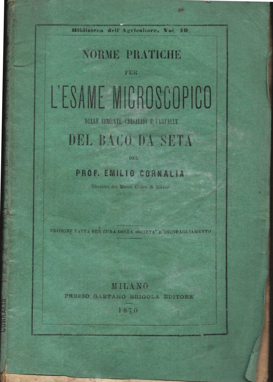 In-8° piccolo (cm 13x19) brossura editoriale verde corallo con titoli al piatto anteriore e paratesti pubblicitari al posteriore. Pp 62, 2 non numerate, 18 figure in bianco e nero e una tabella intercalate nel testo. Alcune pagine leggermente rifilate ma buon esemplare. Seconda edizione stampata nel 1869 di questo utile prontuario pratico da laboratorio, essendo già esaurita la prima edizione del 1860 uscita nell'undecimo volume degli atti della Societa Italiana di Scienze Naturali. Emilio Cornalia (Milano, 1825-ivi, 1882), illustre naturalista, fu dapprima curatore e poi, sino alla morte, direttore del Museo di Storia Naturale di Milano. Fra i fondatori della Società Entomologica Italiana, fu autore di importanti opere di entomologia applicata .